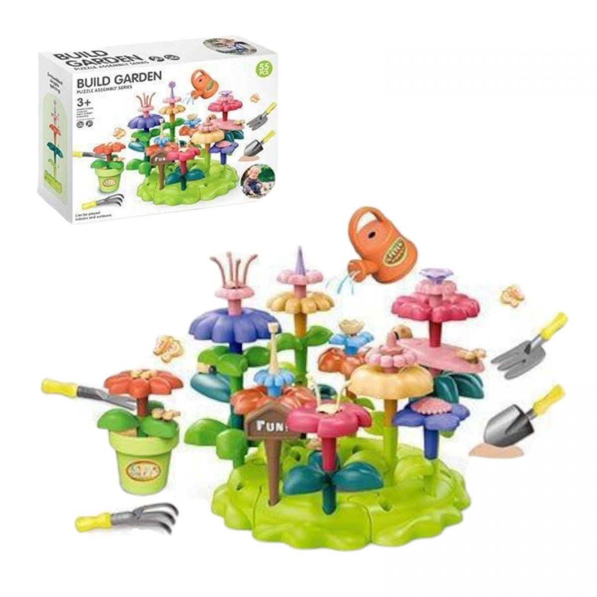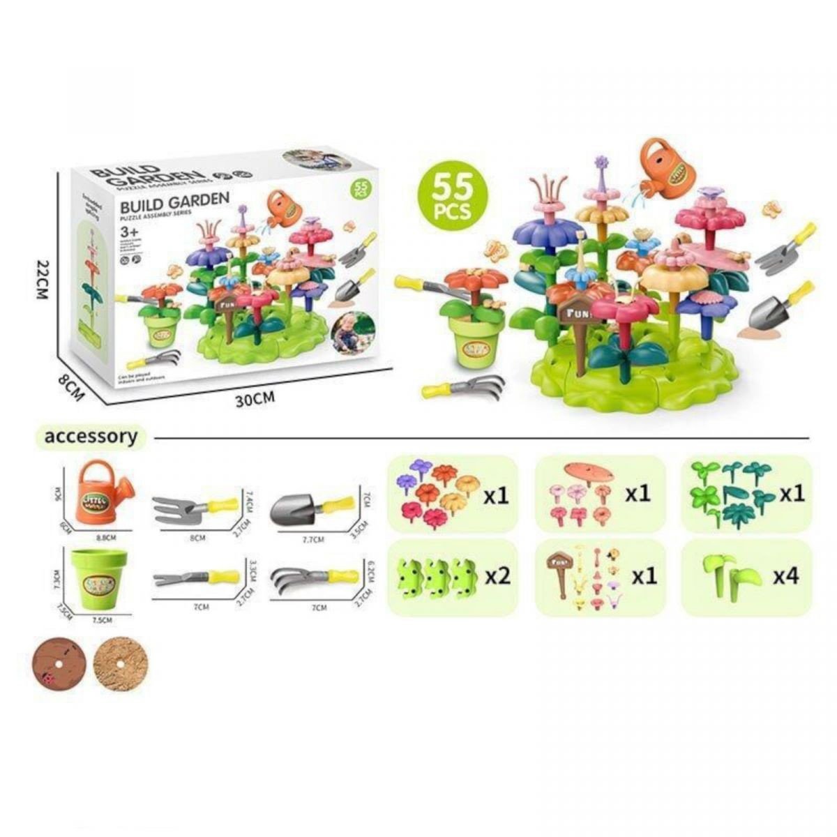 Опис Конструктор “Квітковий сад”, набір садівника, 55 елементів, граблі, лопата, вила, лійка, вазон, квіт