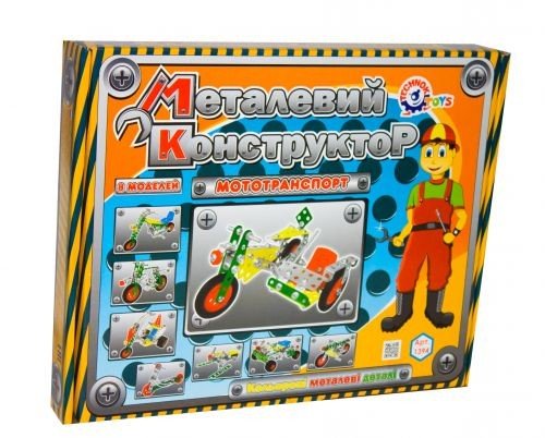 Конструктор металевий "Мототранспорт". 198 деталей в комплекті (гвинтики, планки, гайки, вилки, кермо, колеса, ключі, викрутка і ін.). 8 різних моделей для збирання, покрокова інструкція.