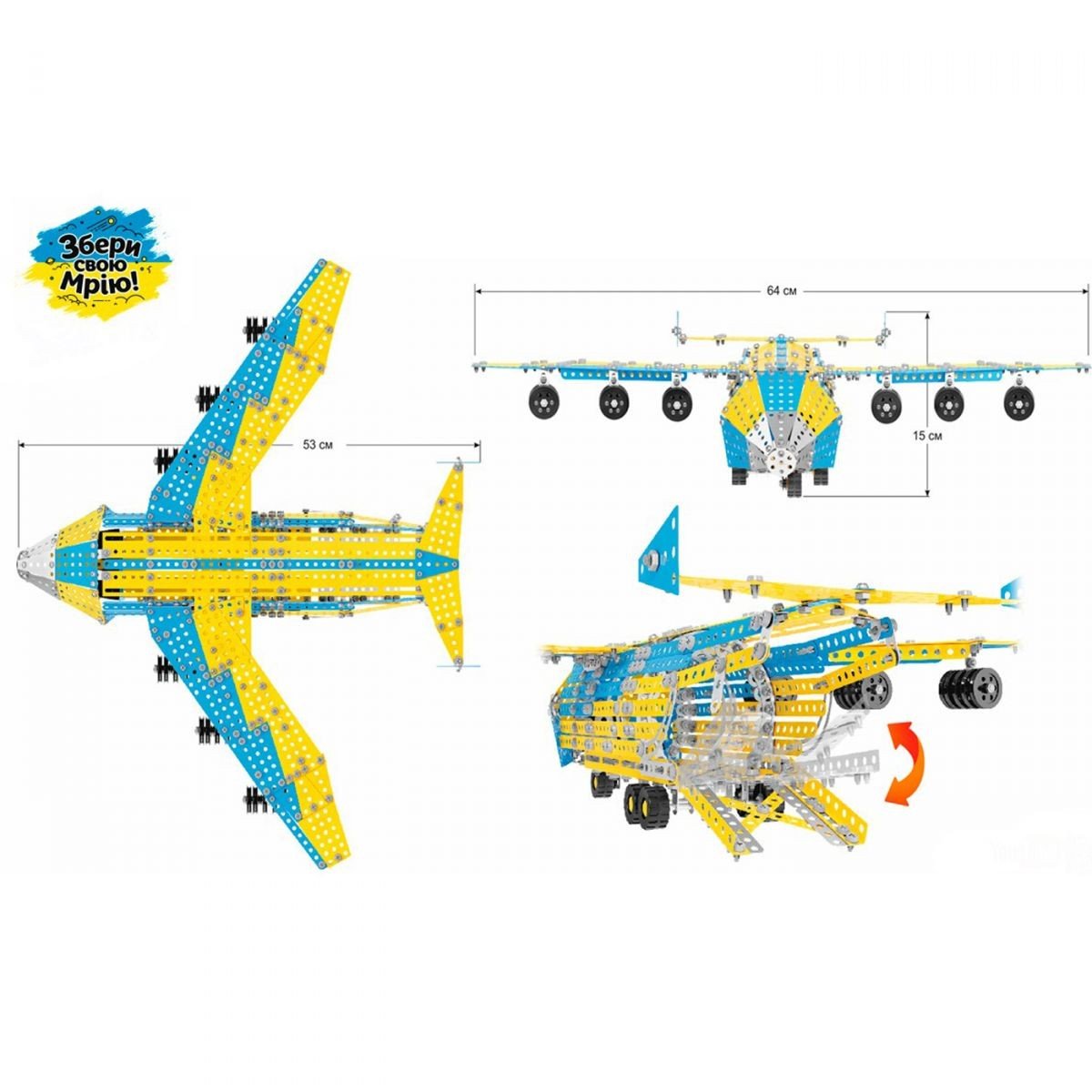 Металевий конструктор Мрія. З його допомогою кожен може зібрати свою мрію. Виготовлено в синьо-жовтих кольорах. Більшість деталей металеві, деякі пластикові. Всього в наборі 1110 деталей. В зібраному стані розміри літака 53х64х15см. Він має рухомі частини. Сподобається юним конструкторам. Набір є веселою та корисною іграшкою, розвиває логічне мислення, уяву та моторику рук.