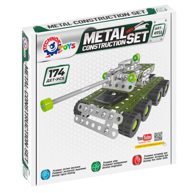 Металевий конструктор "Танк" на 174 деталі. Завдяки цій іграшці дитина отримує перші навички з'єднання деталей гвинтами і гайками, розвиває фантазію і просторову уяву.