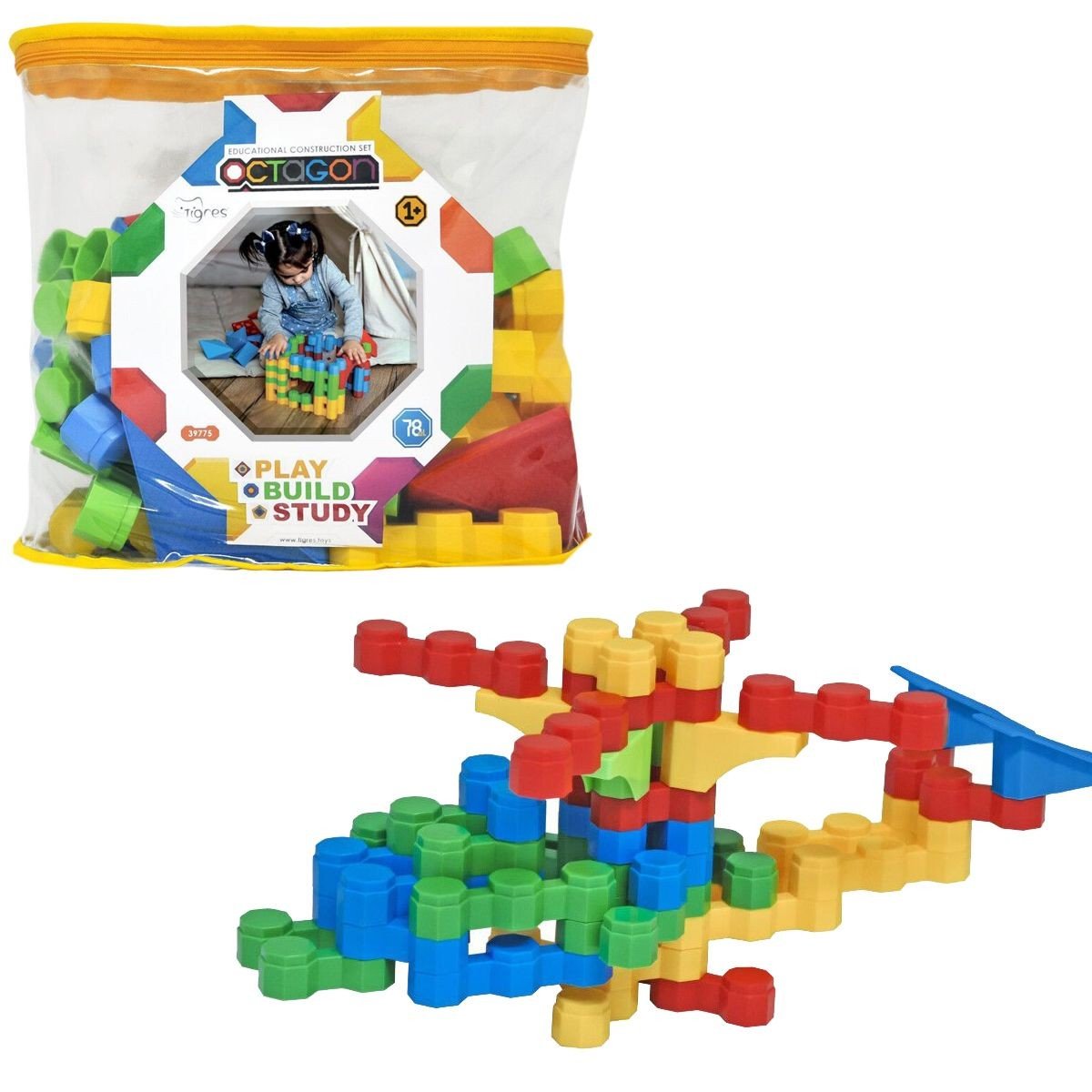 Пластиковий яскравий конструктор. Великі деталі, для дітей від року. Є деталі для побудови будиночків, звірів, цікавих постатей і ще багатьох цікавих речей. Конструктор допомагає розвинути посидючість, уяву і дрібну моторику рук. Виконано з якісного і міцного пластику. У наборі 78 елементів.