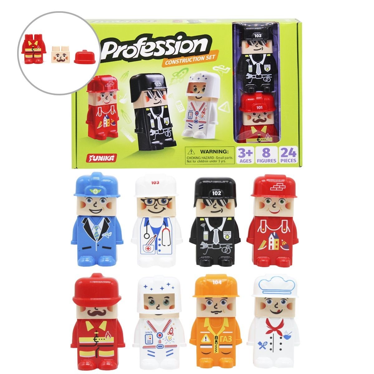 Яскравий цікавий конструктор "Професії" стане чудовим подарунком дитині та познайомить її з безліччю цікавих професій. Усередині є пожежний, космонавт, поліцейський, лікар, будівельник, кухар, пілот, співробітник газової служби. Фігурки легко збираються і складаються із трьох великих деталей, відмінно підійдуть для дітей від 3-х років. Розмір одного персонажа 12 см. Набір виконаний із якісних та безпечних матеріалів.