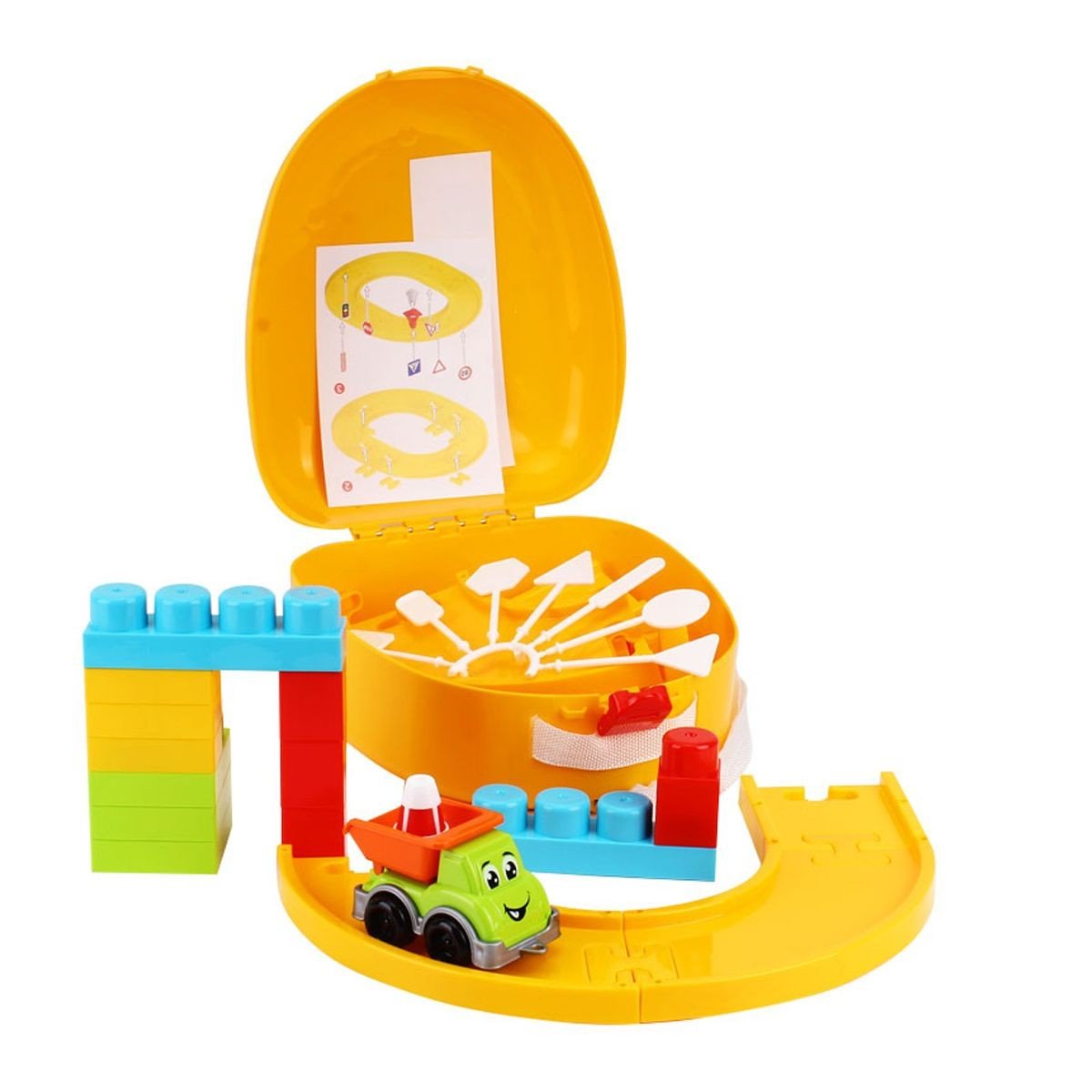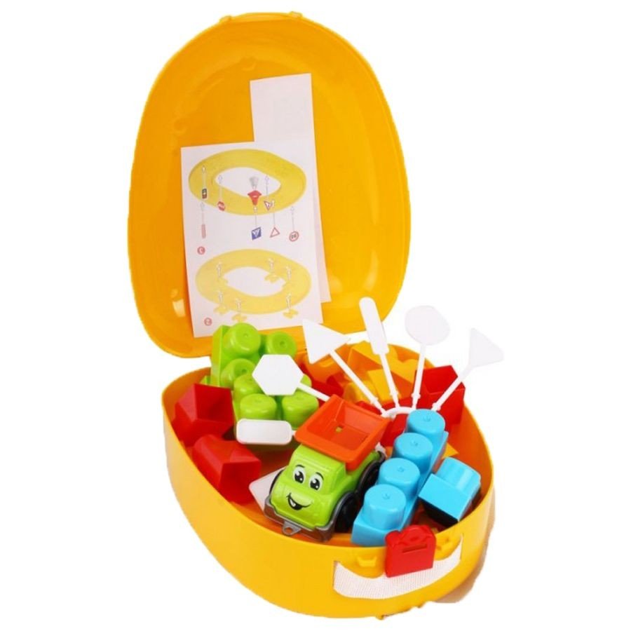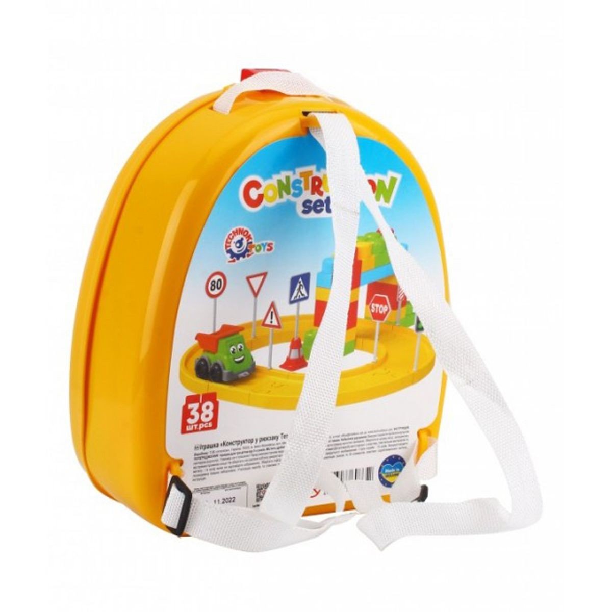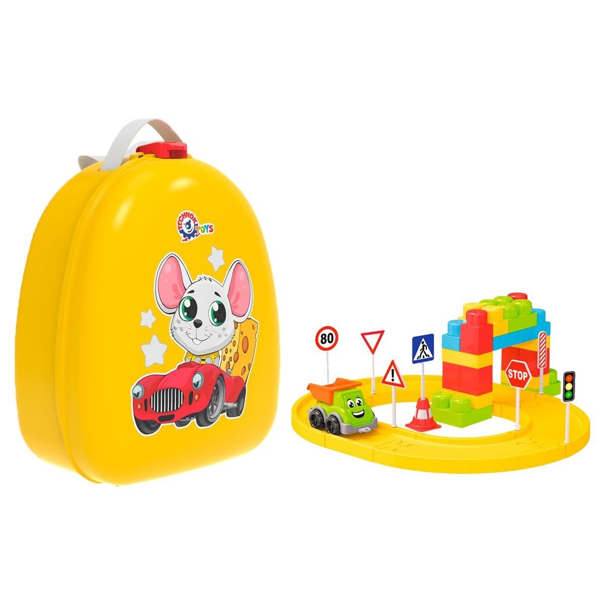 Набір з конструктором у пластиковому рюкзаку. У комплекті 38 деталей, із яких можна зібрати яскравий трек для машинки. У наборі є багато декоративних елементів у вигляді різних дорожніх знаків. Виконано з міцного та безпечного пластику. Для дітей віком від 3-х років.