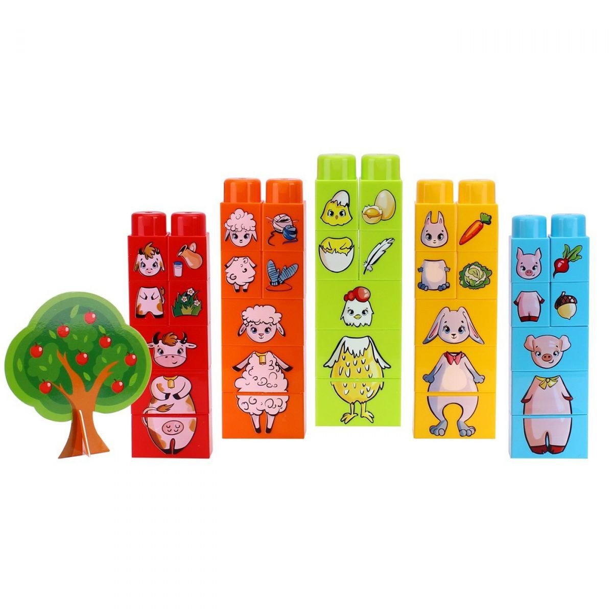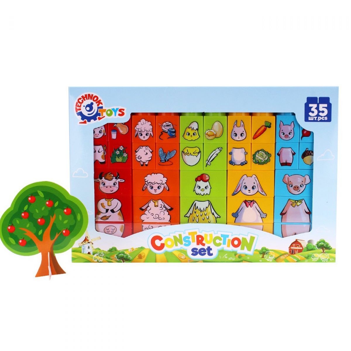 Конструктор з малюнками тварин. Складається з 35 деталей із зображеннями тварин та їжі. Можна з'єднувати в будь-якій послідовності. Конструктор має великий розмір і легкий в складанні, тому підійде дітям від двох років. Всі деталі дуже яскраві, гратися з ними одне задоволення. Також в комплект входить паперове дерево. Виготовлено з якісних матеріалів.