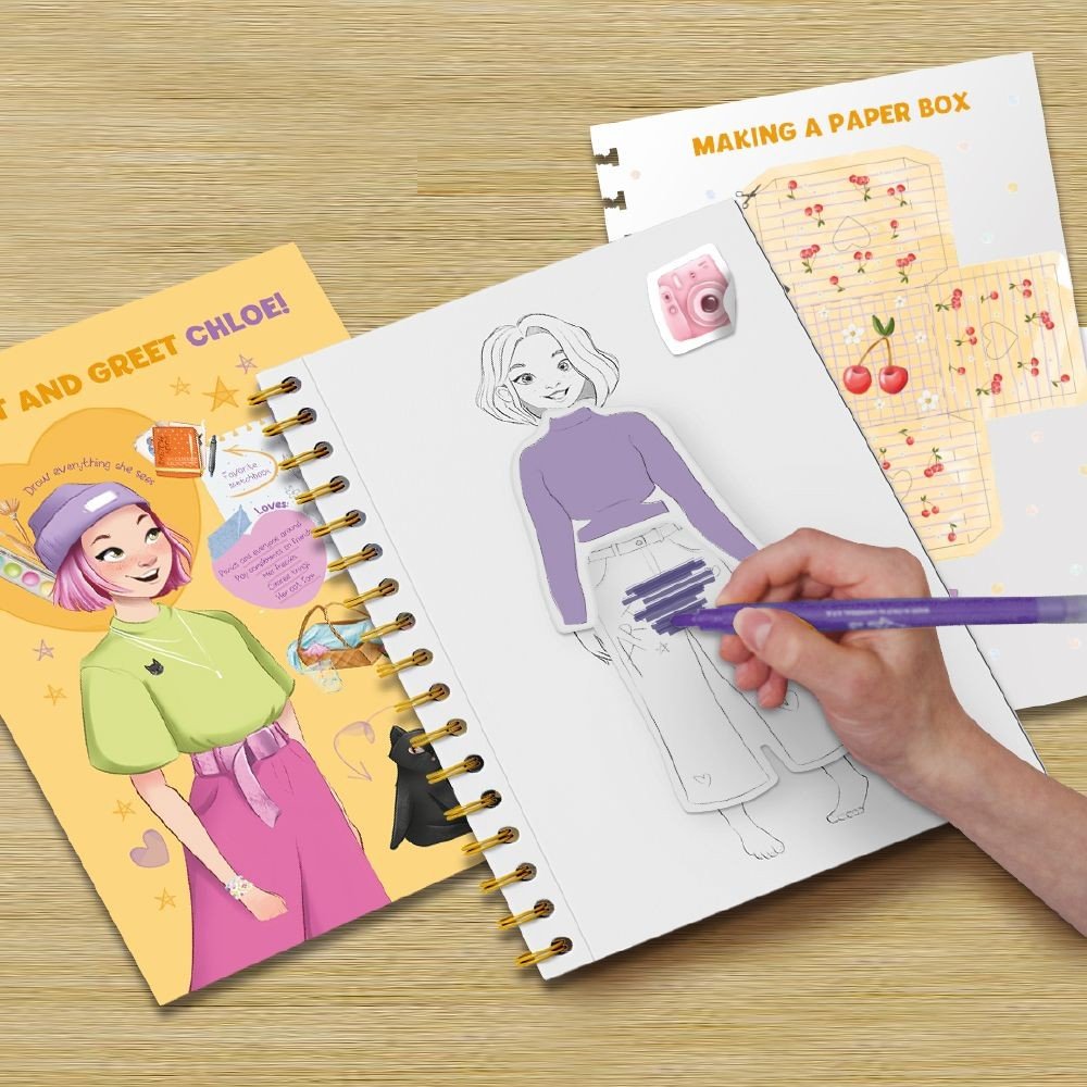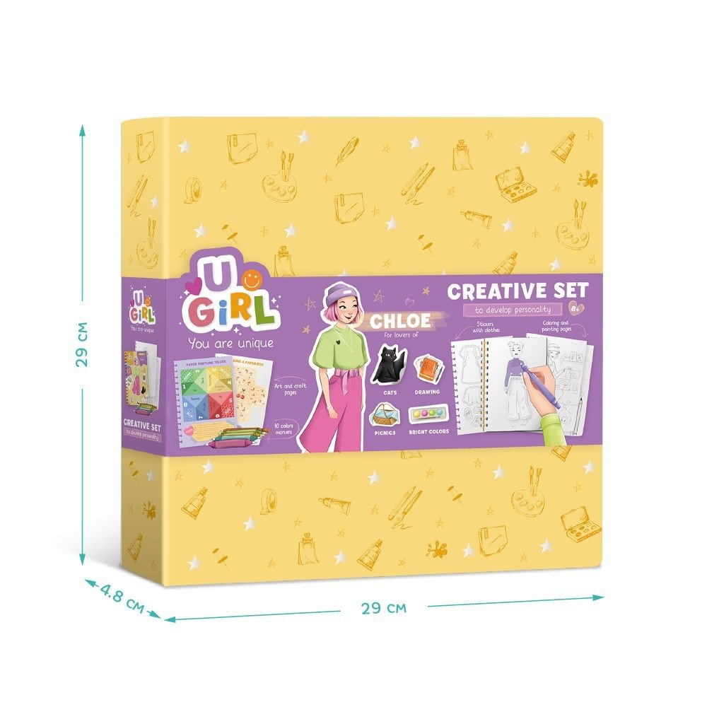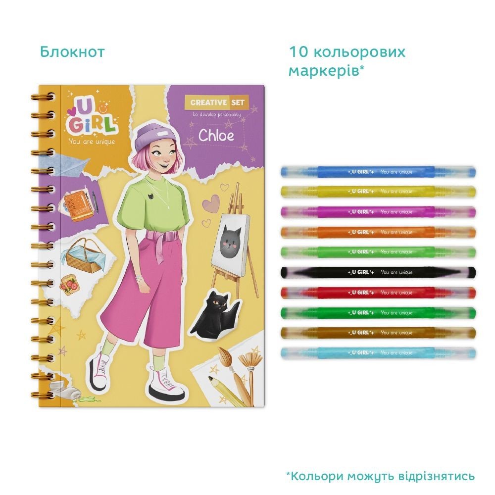 Креативний набір Хлоя – це чудовий подарунок для дітей, які люблять малювати, фантазувати та створювати власні історії. Набір упаковано в стильну подарункову коробку на магніті, яка зручно зберігає всі елементи та робить його ідеальним для презенту. Всередині знаходиться блокнот на пружині, наповнений наліпками та творчими завданнями, що стимулюють уяву та допомагають розвивати дрібну моторику. Для творчості та малювання передбачені 10 двосторонніх маркерів, які дозволяють експериментувати з різними кольорами та відтінками. Крім того, набір містить сторінку коміксу, що надихає дітей створювати власні історії та розвивати навички сюжетного мислення.