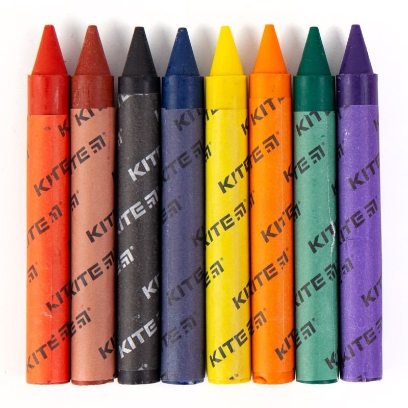 Кольорова воскова крейда Kite Jumbo в яскравій картонній упаковці Kite Dogs. Набір має таку палітру: помаранчевий, червоний, синій, чорний, жовтий, зелений, фіолетовий і коричневий кольори. Крейда яскрава та насичена, має однорідну текстуру, не кришиться. Малює яскраво без натиску. Воскова крейда легко заточується. Вона призначена для малювання на папері. Дитячу крейду приємно та зручно тримати в руках (довжина виробу 100 мм, діаметр - 12 мм.), корпус захищений папером - не мажеться і не вислизає з рук. Воскова крейда зроблена з натурального воску з додаванням фарб. Крейда має нейтральний запах. Продукція пройшла гігієнічні дослідження і не містить шкідливих речовин. Рекомендовано дітям дошкільного та шкільного віку.