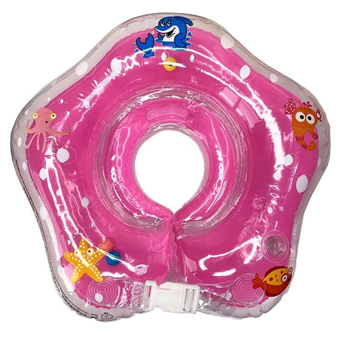 Надувне коло на шию для купання дітей від народження до 3-х років та вагою від 4 до 20 кг. Має спеціальну ямку-поглиблення для підборіддя, яке фіксує правильне положення голови. Двостороннє кріплення – пластикові карабіни. Зручні ручки з боків. У внутрішній частині кола знаходиться кулька-брязкальце. Малюнок може відрізнятись.