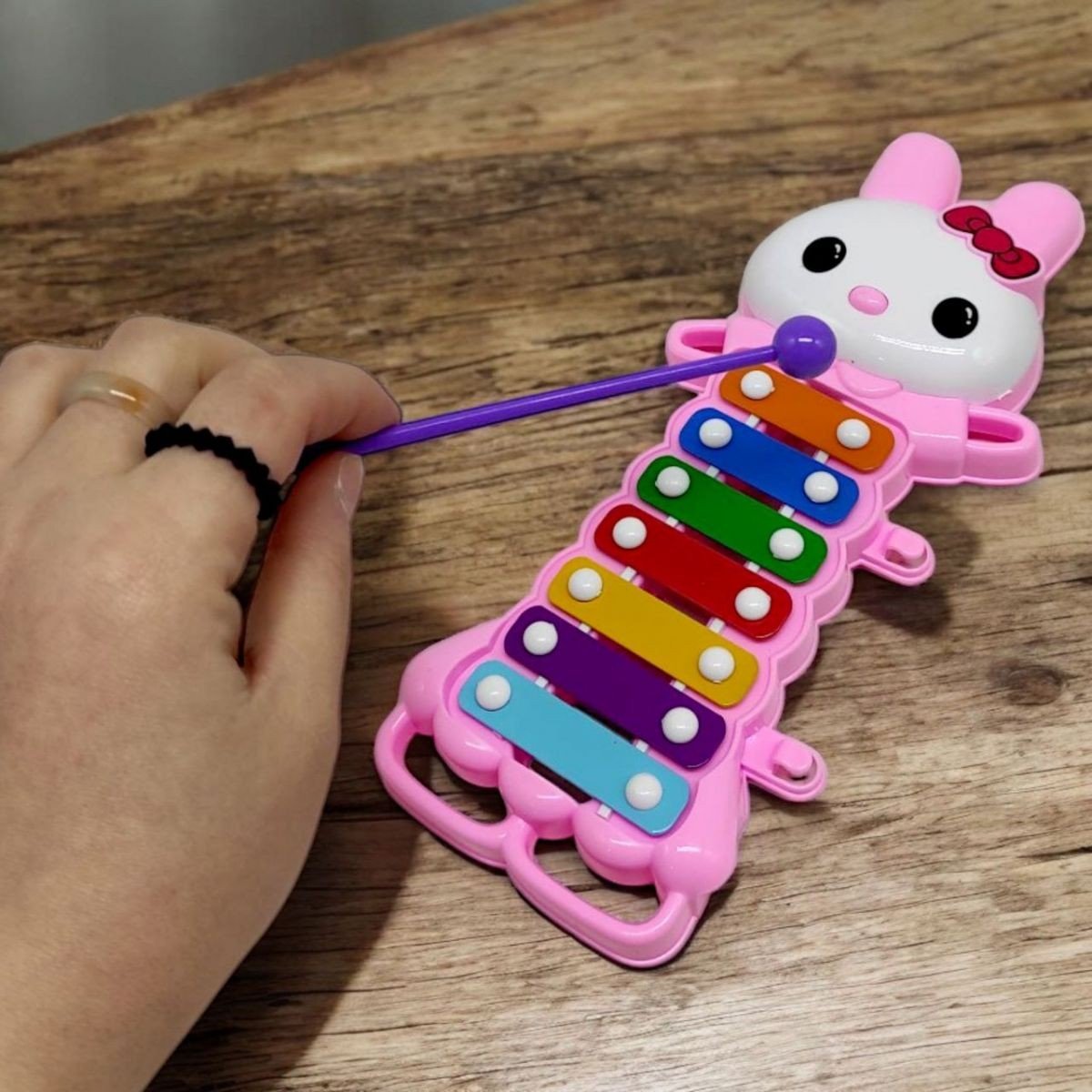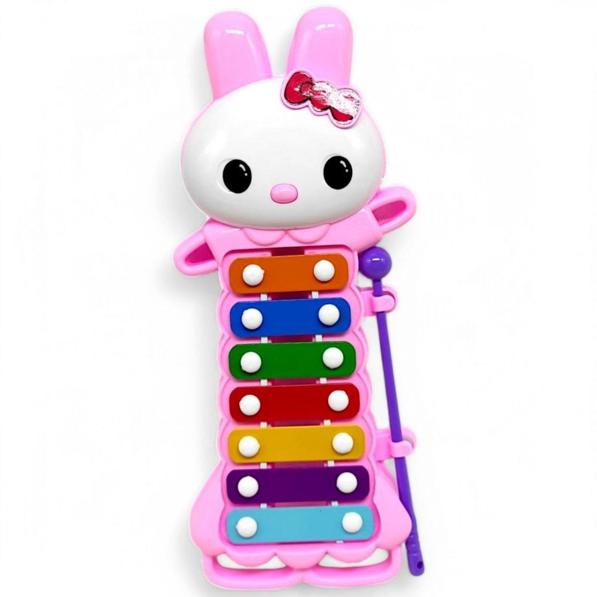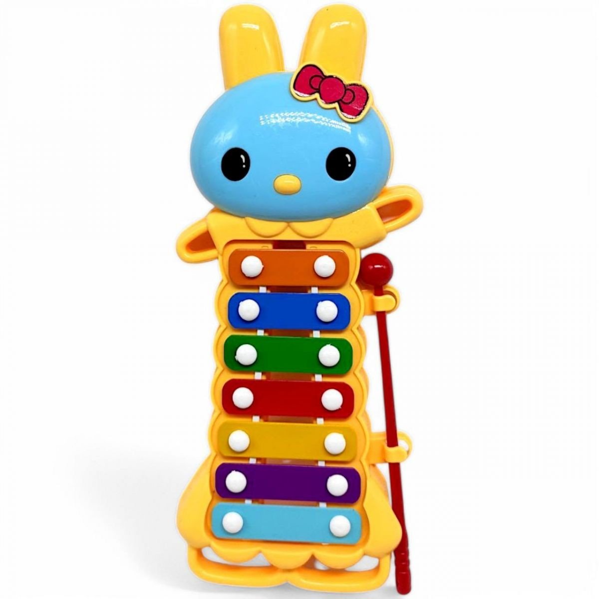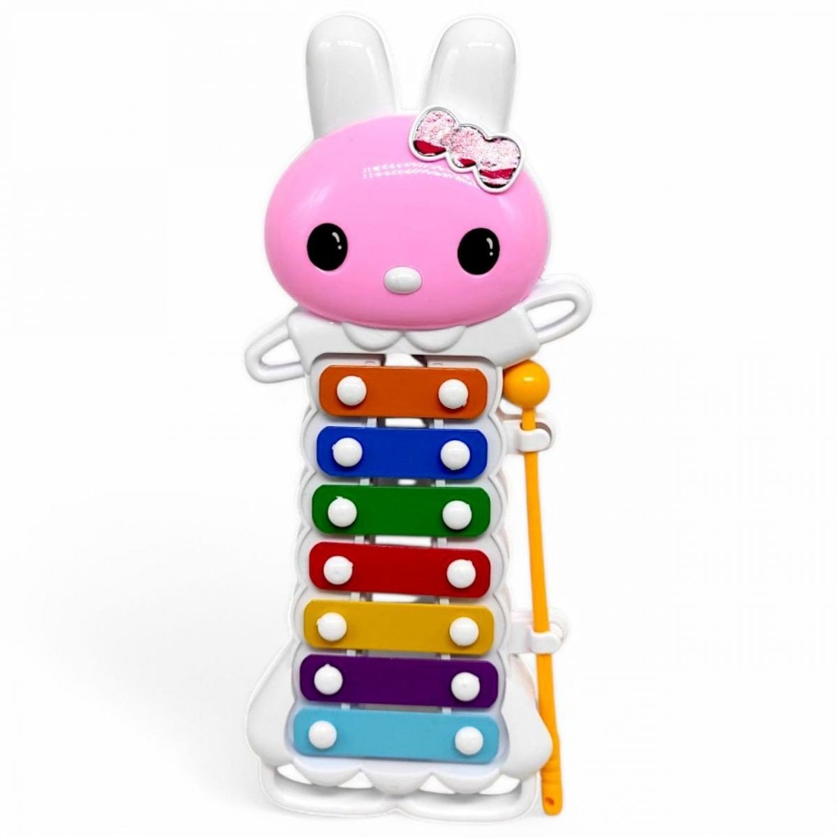 Ксилофон дитячий "Зайчик", 7 тонів - яскравий музичний інструмент для малюків, оформлений у вигляді милого зайчика. Складається із 7 різнокольорових металевих пластин, кожна з яких видає звук. У комплект входить паличка для гри. Ідеально підходить для розвитку слуху, моторики та почуття ритму. В наявності різні варіанти кольорів.