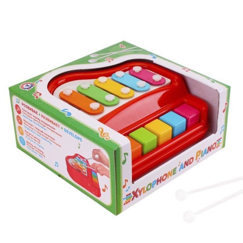 Оригінальний ксилофон у формі фортепіано. 5 клавіш. У комплекті є дві палички для гри на інструменті. Також грати на інструменті можна натискаючи клавіші піаніно відповідного кольору. Основа іграшки виготовлена із пластику, а клавіші – з металу. Ксилофон дуже яскравий та дзвінкий.