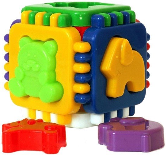 Кубик логічний. Сортер у вигляді складаються куба. Складається їх 6 ємностей з отворами різної форми і розміру, а також фігурок-вкладишів у вигляді тварин.