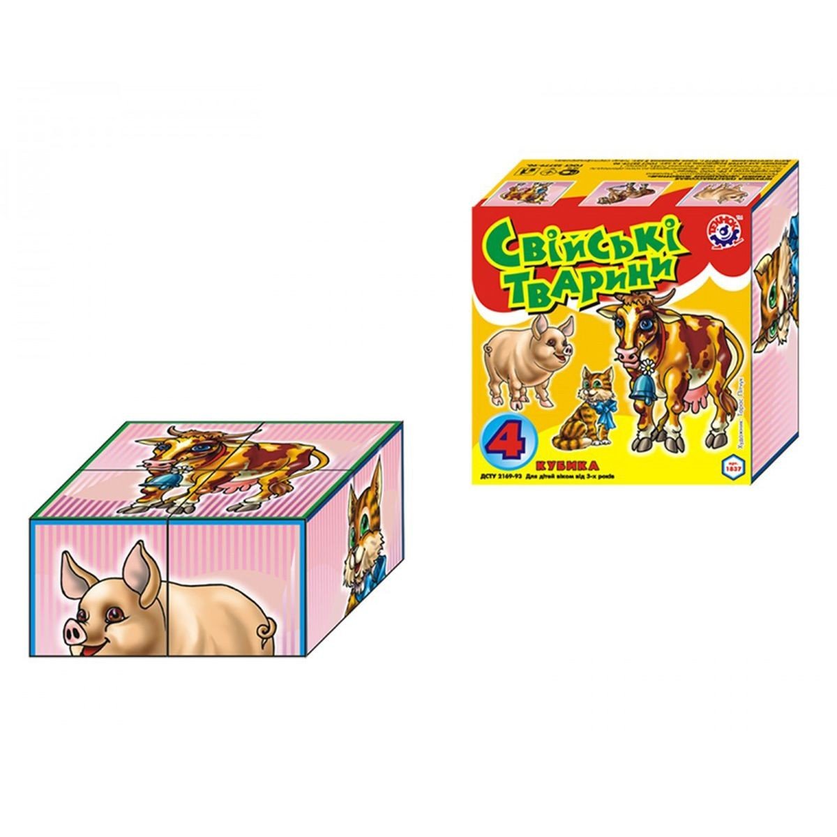 4 яскравих пластикових кубика. На кожній з граней - фрагменти зображення домашніх тварин, які потрібно зібрати в один малюнок. 6 різних картинок: кішка, собака, коза, свинка, конячка і корова. Розмір одного кубика: 4 х 4 см.