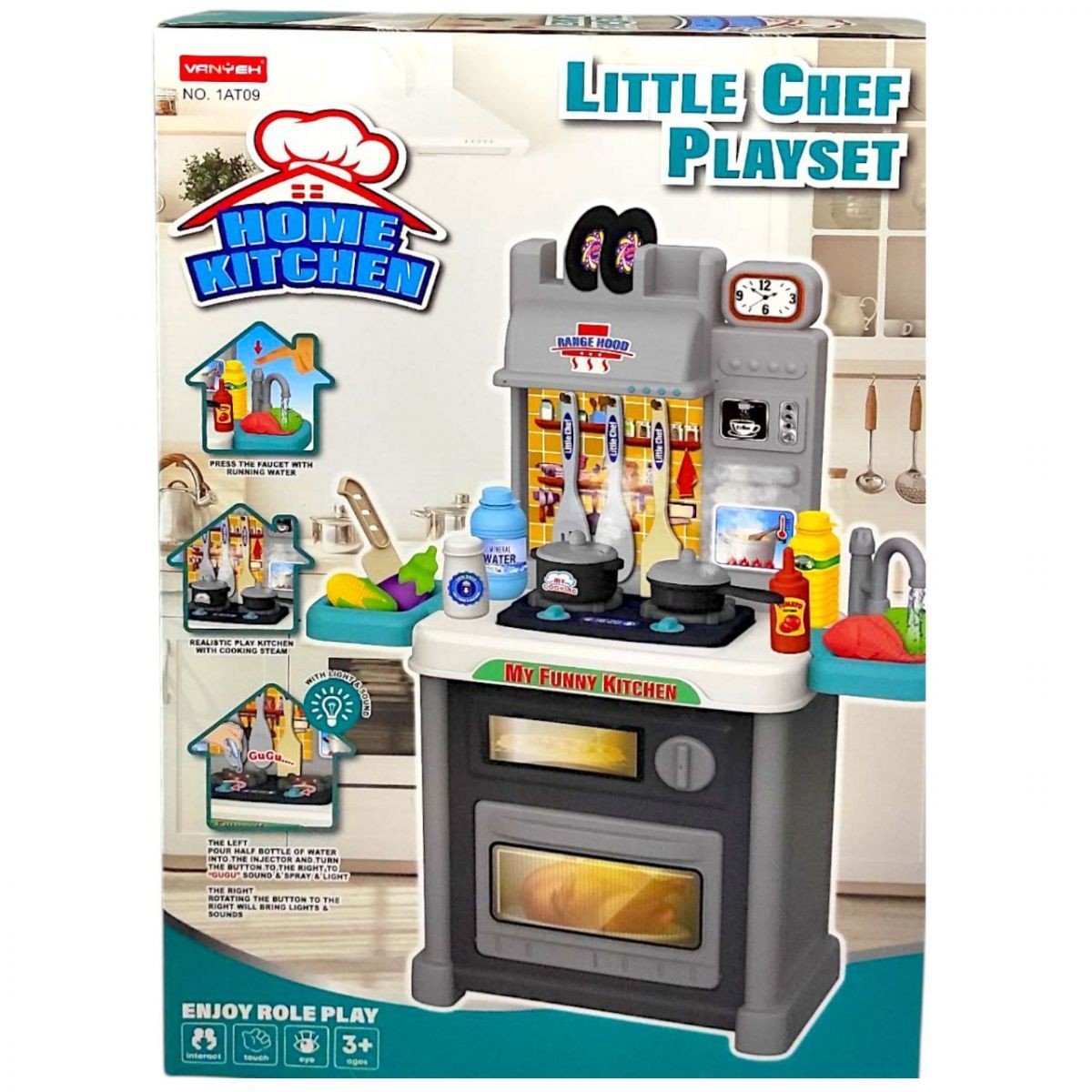 Бренд: Vanyeh Упаковка: Коробка Колір: Різнобарв'я Тип ел-тів живлення: Батарейки,АА Кількість ел-тів живлення: 3 Ел-ти живлення в комплекті: Ні Вага з упаковкою: 1680 г Габарити в упаковці: 13.5 x 39 x 57.5 см Матеріал: Пластик Комплектація: кухня, аксесуари