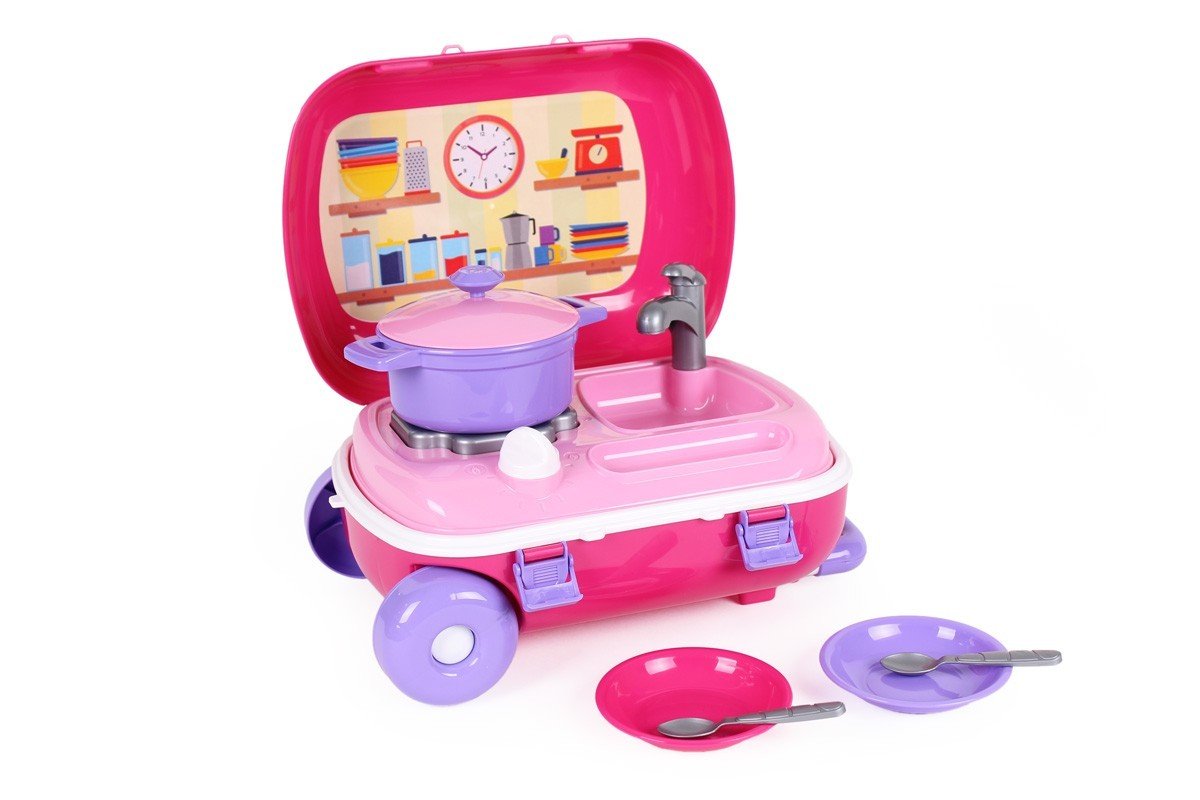 Іграшкова кухня з посудом в яскравому рожевому валізі. Валіза має великі міцні колеса, зручну ручку, що регулюється і надійні засувки. Трансформується в маленьку кухню з плитою, краном і посудом.