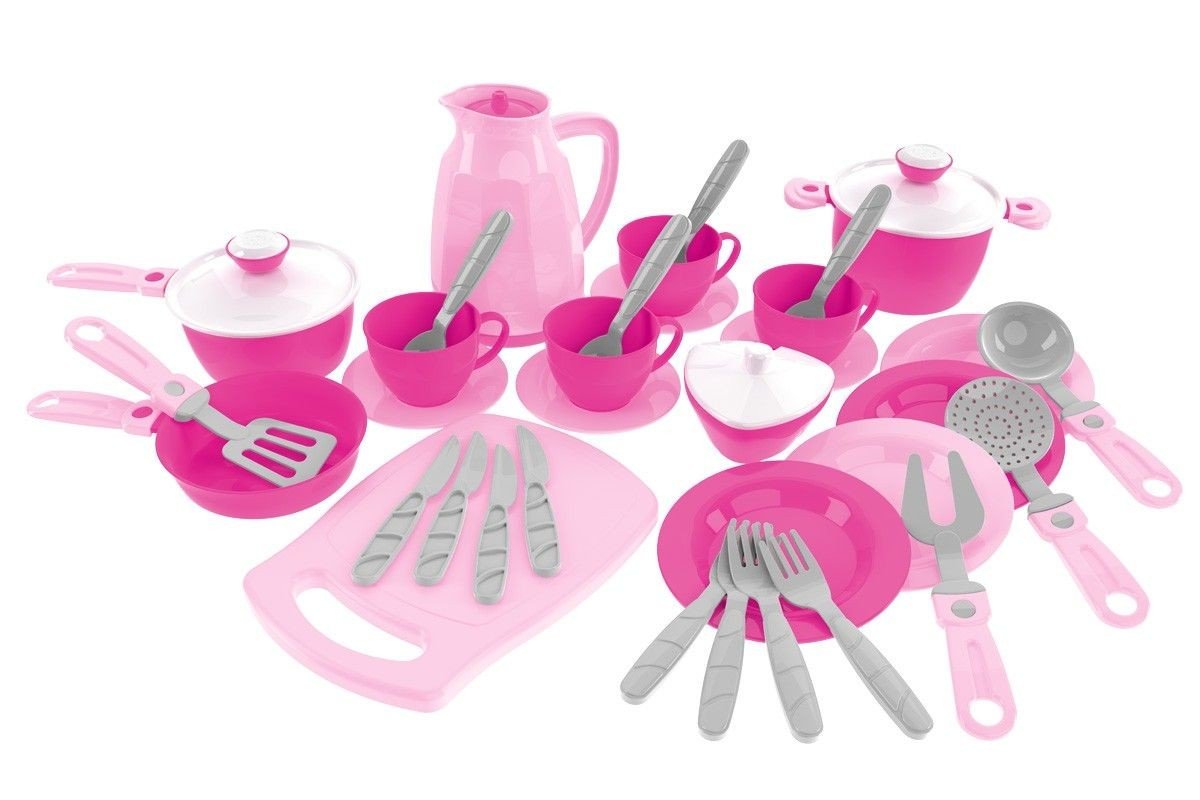 Комплектація: 38 предметів (сковорідка, каструля, сотейник, цукорниця з кришкою, кавник з кришкою, дощечка для нарізки, черпак, шумовка, вилка велика, лопатка, кришка - 2 шт., Тарілка - 4 шт., Блюдце - 4 шт., Чашка - 4 шт., ложечка - 4 шт., вилка - 4 шт., ніж - 4