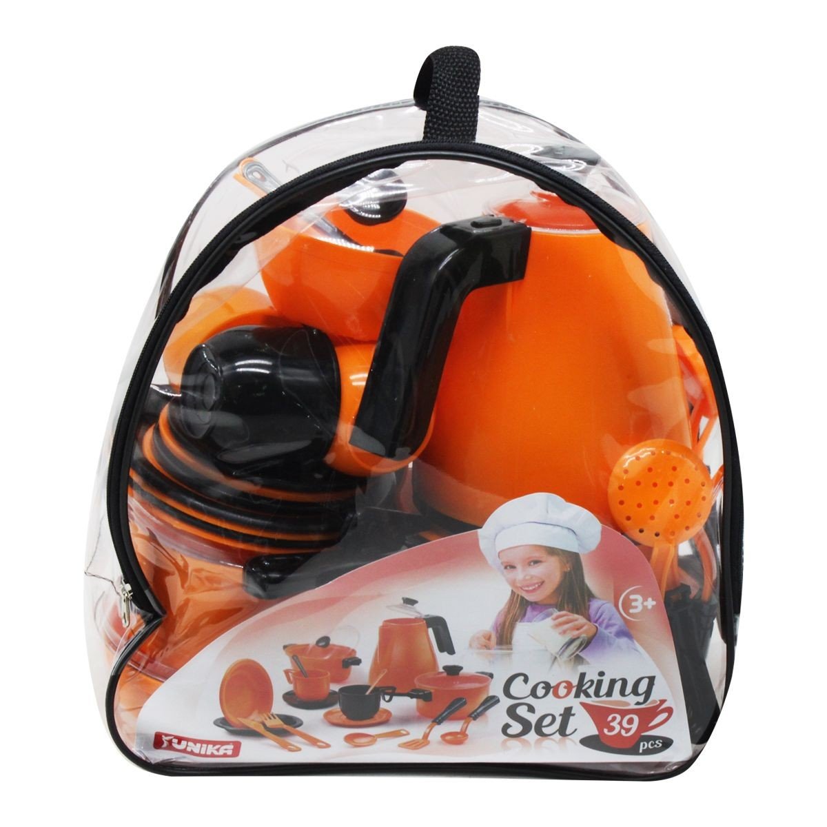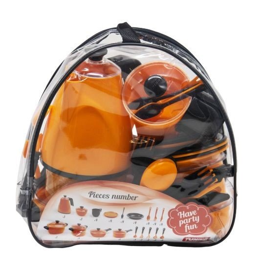 Комплектація: чайник, 2 каструльки (велика і маленька), сковорідка, мисочка, 8 тарілочок (4 великих і 4 маленьких), кухонні прилади: ополоник великий, ополоник маленький, ополоник з дірочками, лопатка, велика кухарська вилка (по одному) ; і столові прибори: ложки чайні, ложки столові, вилки, ножі (по 4). Всього 39 шт.