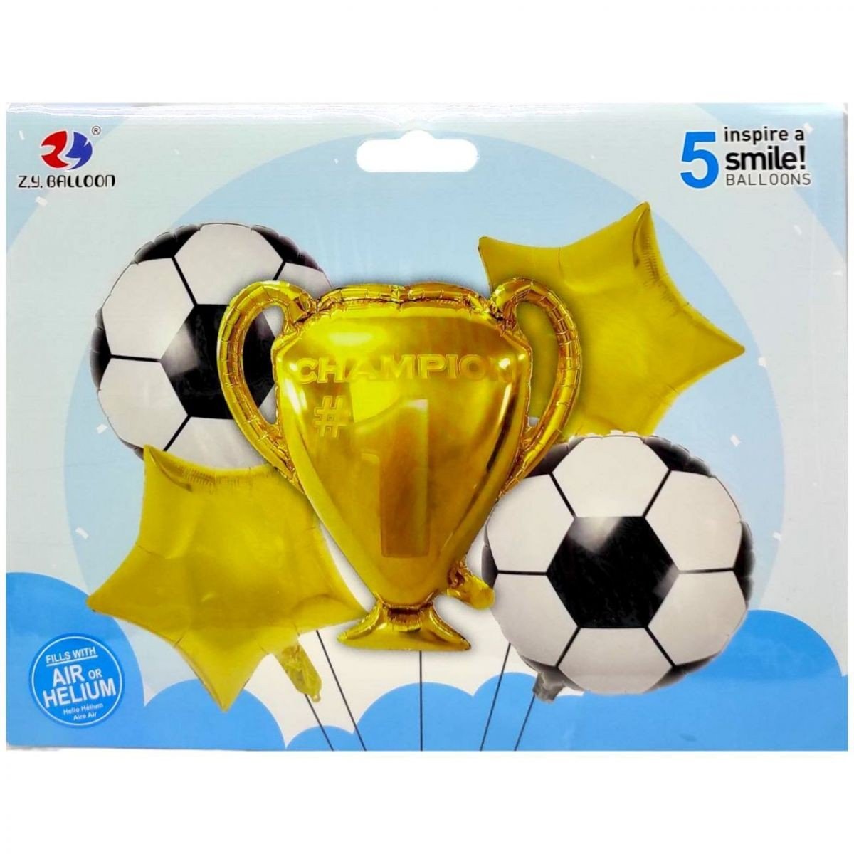 Яскравий набір кульок "Футбол". Милий та барвистий комплект. У наборі 5 фольгованих кульок: 1 велика кулька у вигляді переможного кубку, 2 з футбольними мʼячами, та 2 зірки. Всі кульки якісні та надійні. Принесуть безліч позитивних емоцій імениннику та гостям на святі!