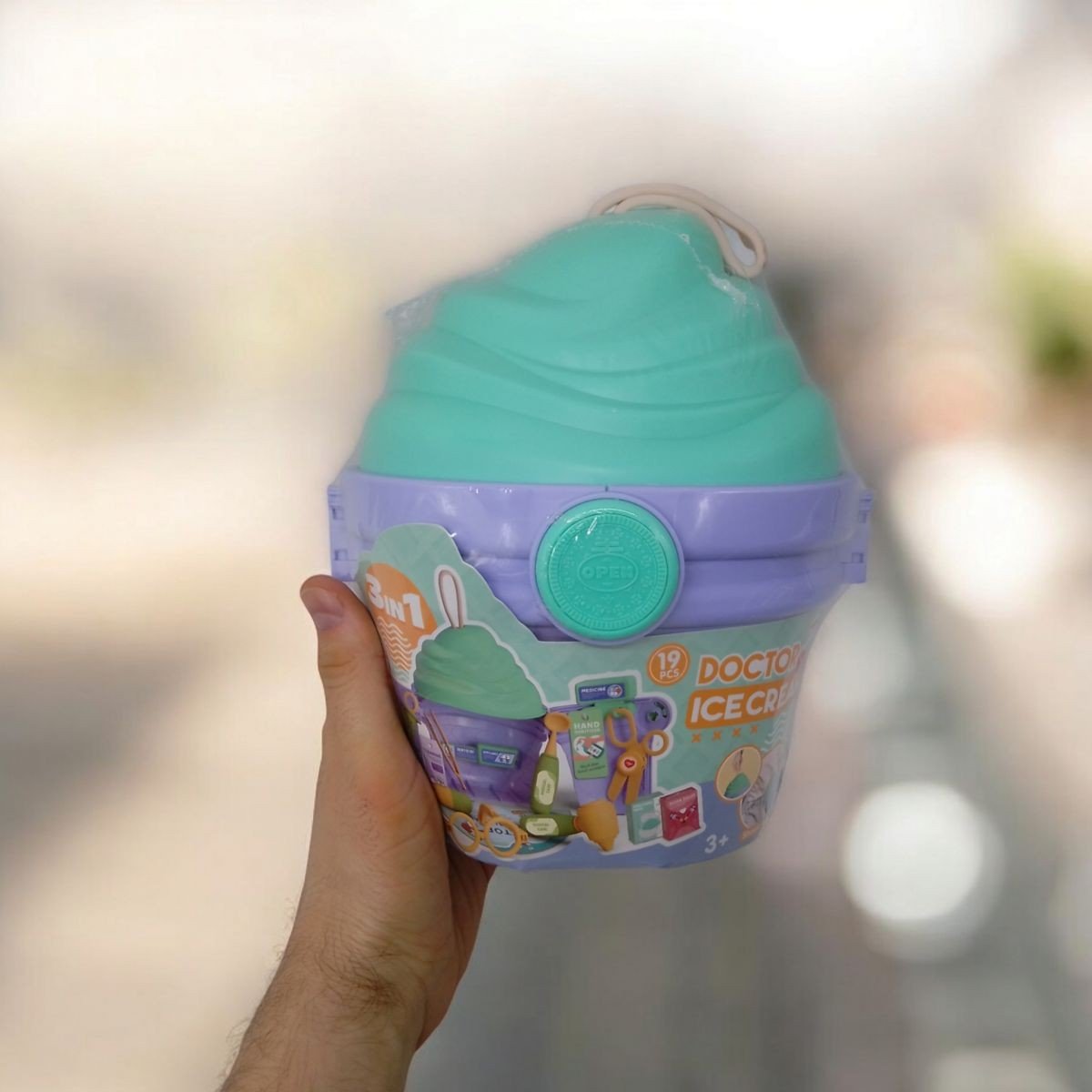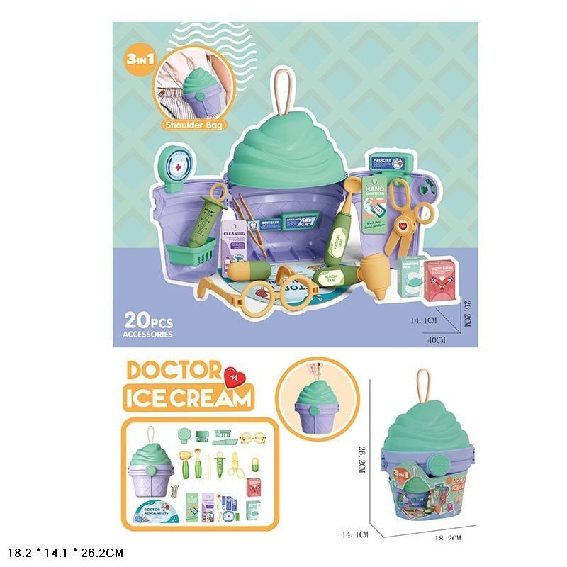 Лікарський набір у стильній упаковці у вигляді морозива. Упаковку можна використовувати і як сумочку. Усередині все, що потрібно справжньому лікареві: окуляри ножиці, шприц, пігулка, пінцет, інструменти лора, різні імітаційні коробочки таблеток. Усього 19 елементів.