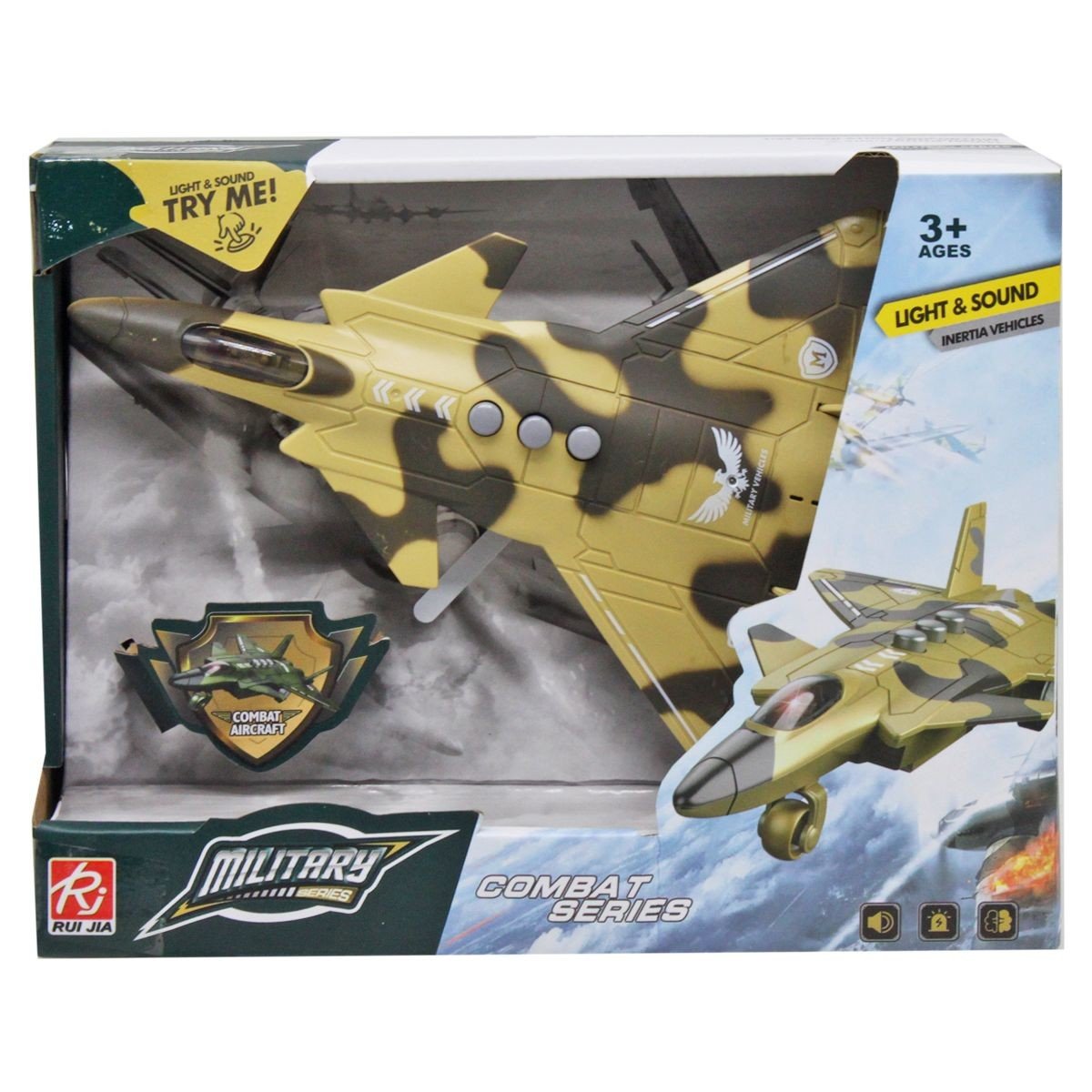Пластикова іграшка у вигляді військового винищувача зі звуковими та світловими ефектами. При натисканні на кнопки іграшка видає звуки роботи мотора та турбін, а всередині кабіни вмикається підсвічування. Літак оснащений коліщатками. Іграшка виконана з міцного та якісного пластику.