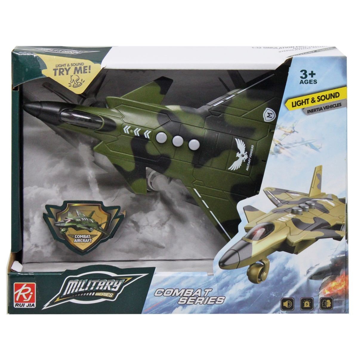 Пластикова іграшка у вигляді військового винищувача зі звуковими та світловими ефектами. При натисканні на кнопки іграшка видає звуки роботи мотора та турбін, а всередині кабіни вмикається підсвічування. Літак оснащений коліщатками. Іграшка виконана з міцного та якісного пластику.