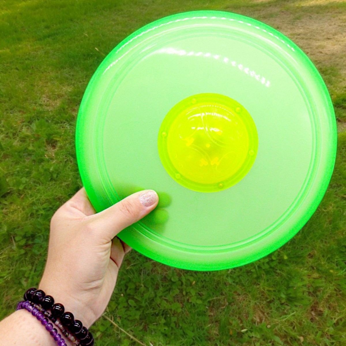 Тарілка "Фризбі" з якісного пластику. Володіє неймовірними аеродинамічними властивостями. Іграшка оснащена світловими ефектами (миготить різними кольорами), котрі активуються натиском на кнопку. Літаюча тарілка прекрасно підійде для активних ігор надворі. Діаметр - 22,5 м.