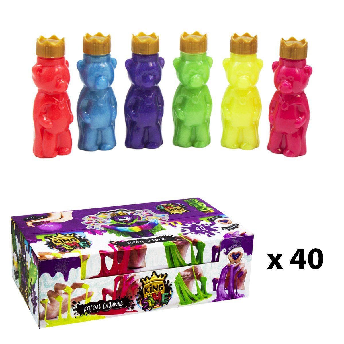 Лизун-соплі "Ведмедик King Slime". Складається з вʼязкого, рідкого матеріалу, має приємний запах. З глітером, можна надувати. Ціна за баночку (40 в коробці).