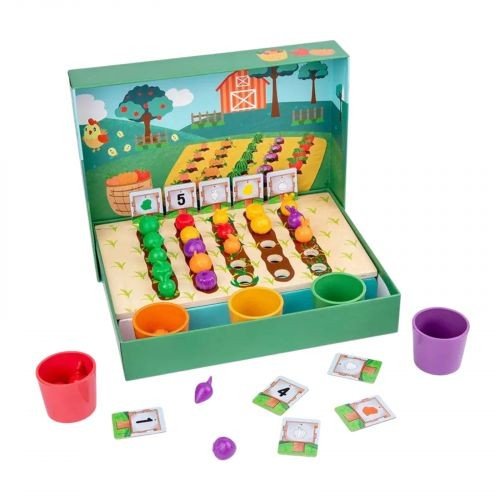 Логічна гра дерев’яна основа, 5 чаш для сортування, 25 гумових овочів, 10 двосторонніх карток із зав