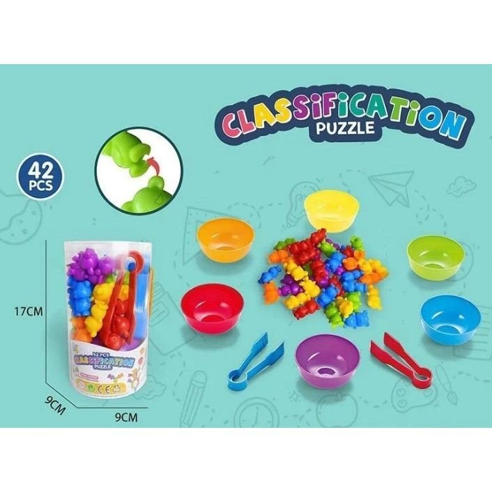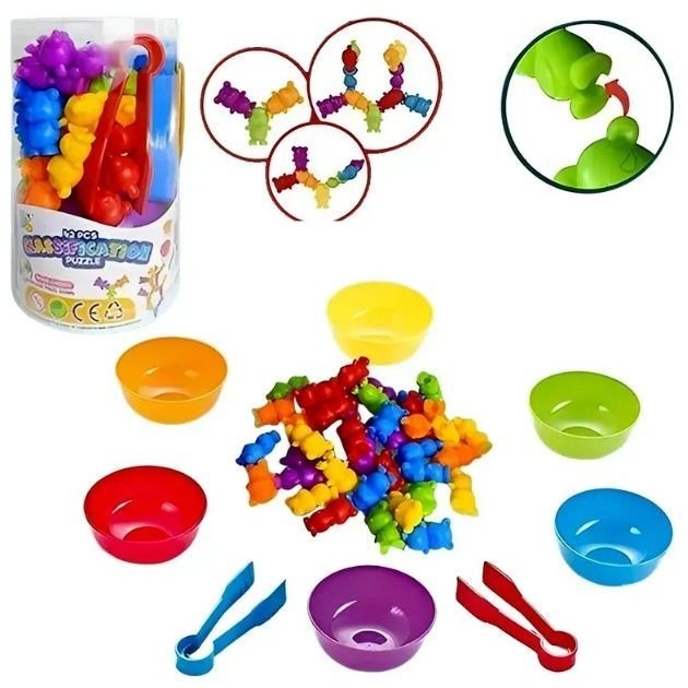 Логічна гра-сортер допомагає дитині вивчати кольори та тренувати дрібну моторику у формі захопливої гри. У наборі є 42 яскравих фігурок, 6 тарілочок для сортування та щипці, за допомогою яких малюк перекладає елементи за кольорами. Гра розвиває координацію рухів, уважність і логічне мислення, орієнтовно підходить для дітей від 3 років.