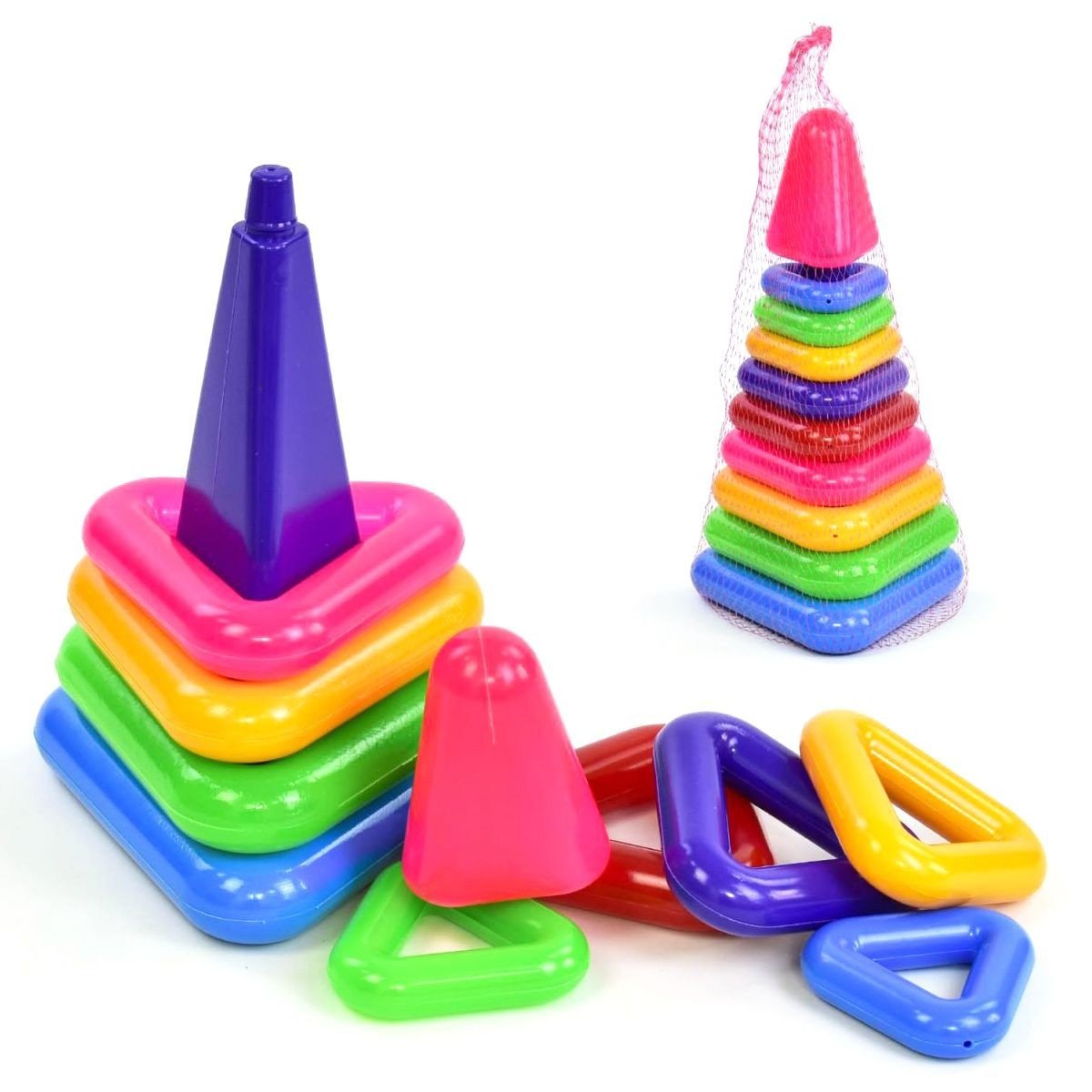 Логічна іграшка "Пірамідка трикутна. Пірамідка складається з трикутного підстави, 8-ми кілець трикутної форми, і вершини у вигляді округленій конуса. Пірамідка розвиває дрібну моторику, координацію рухів, пам'ять і увагу.