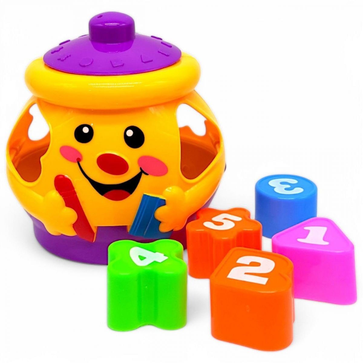 Сортер у вигляді горщика — це яскрава іграшка для малюків, що розвиває. У комплекті 5 кольорових фігурок з цифрами, кожна з яких відповідає отвору на іграшці Іграшка допомагає дітям вивчати форми, кольори, цифри, розвиває моторику та логічне мислення.
