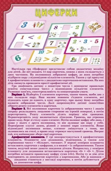 Логічна мозаїка "Циферки". Настільна гра представляє собою дидактичну мозаїку для дітей. У неї входять 14 пар карток, кожна з яких складається 2-х частин. На половинах зображені цифри, до яких потрібно підібрати пару з відповідною кількістю елементів. У грі присутні 4 арифметичних планшета з 20 картками-вставками.