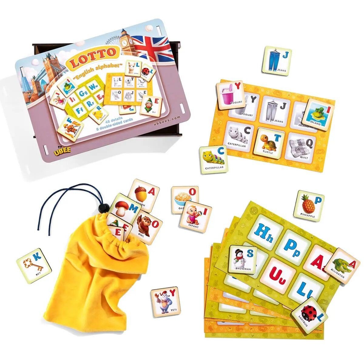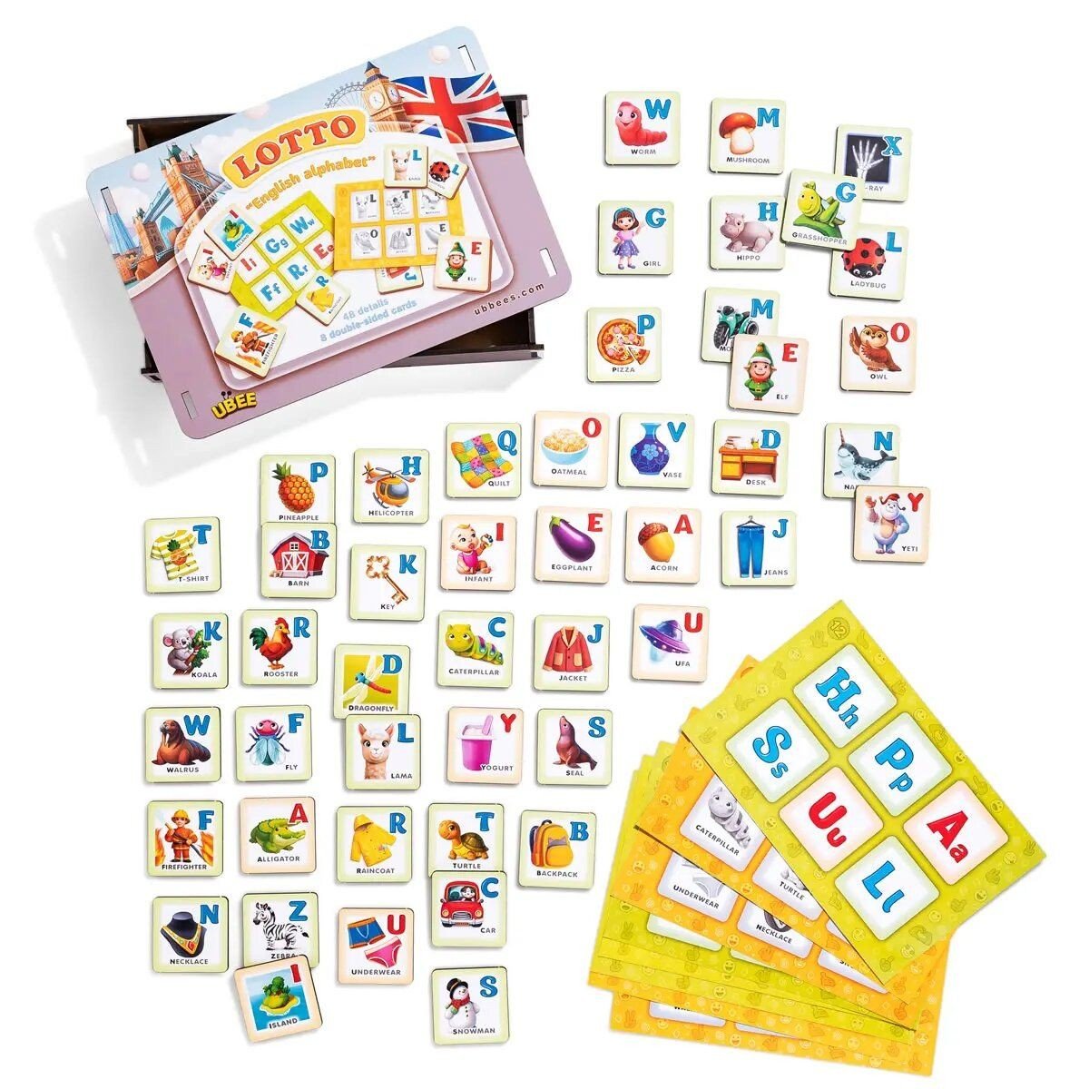 Бренд: Ubee Упаковка: Плівка Колір: Різнобарв'я Вага з упаковкою: 670 г Габарити в упаковці: 16 x 22 x 4.5 см Країна виробник: Україна Матеріал: Дерево Комплектація: 48 елементів, 8 двосторонніх карток