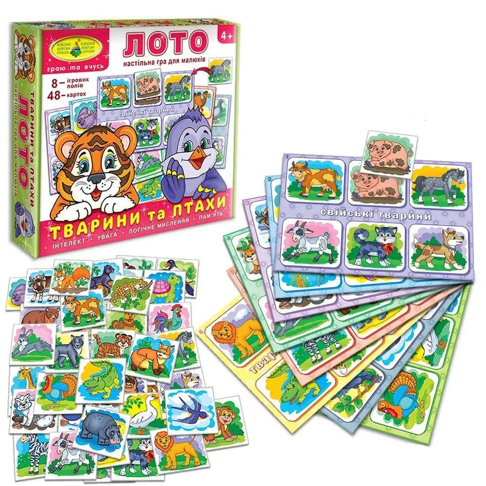 Яскрава логічна гра для малюків дошкільного віку підійде, як для занять вдома, так і в школах раннього розвитку та дитячих садках. Гра допоможе вашій дитині розвинути мовленнєві навички, логічне мислення, увагу, інтелект, пам'ять. Познайомить з чарівним світом тварин та птахів. У наборі є 8 ігрових полів лото та 48 тематичних карток. На пакуванні вказані декілька варіантів правил гри.Для дітей віком від 4-х років.
