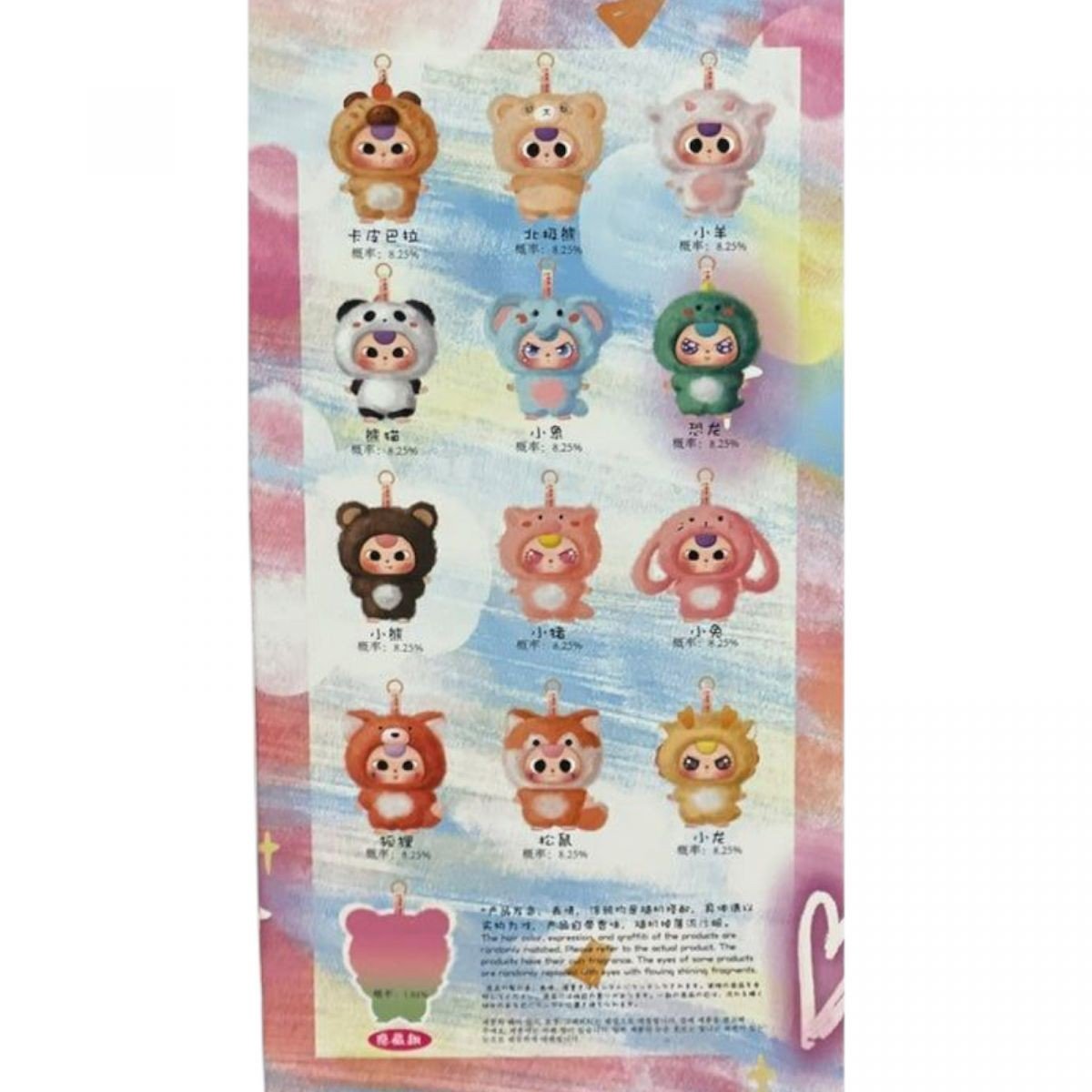 Іграшка-брелок упакована в повністю герметичний пакет. Навіть їхні творці не знають, яка фігурка знаходиться в якому пакеті, тому відкриття пакета супроводжується відчуттям хвилювання та очікування. Кожна фігурка представлена у вигляді якоїсь тваринки. Має кільце для ключів, яке ідеально підходить для кріплення до ключів, сумочок або одягу. Тіло виконане з приємного на дотик мʼякого матеріалу. Вираз емоцій в лялечок на вищому рівні — веселі, сумні чи здивовані, дізнайся яке личко має твій брелочок!