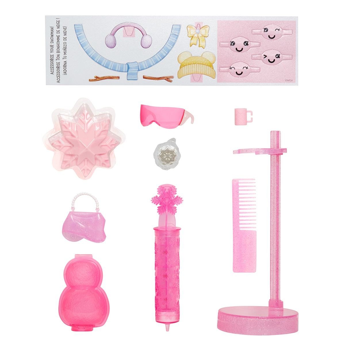 Комплектація: Лялька, елемент одягу зі сніжним порошком, пара взуття, аксесуари, гребінець для волосся, підставка, шприц, формочка для сніговика, пачка кінетичного піску, пачка порошку, 1 картка з аксесуарами для сніговика, інструкція