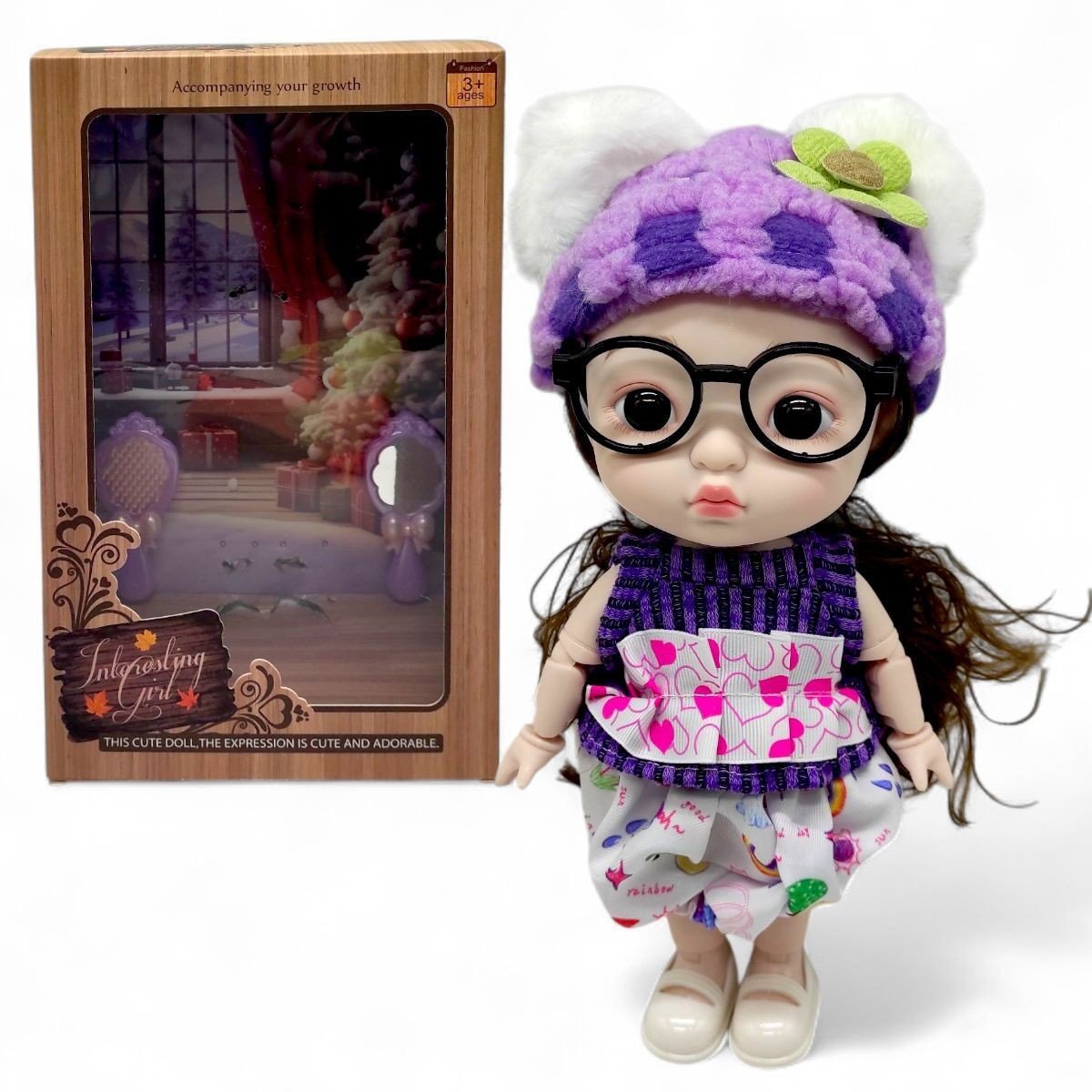 Лялька "Interesting Girl" - це модна ігрова лялька, яка вирізняється великою головою, виразними рисами обличчя та шарнірною конструкцією тіла. Лялька має великі круглі окуляри та довге каштанове волосся. Одягнена у комплект, який показує її унікальний стиль та робить дівчинку ще милішою. Висота ляльки становить 28 см, має рухомі суглоби, що дозволяє їй приймати різні пози. У комплекті є дзеркальце та гребінець для догляду за волоссям. Підходить для дітей від 3+ років, сприяє розвитку естетичного смаку та рольової гри.