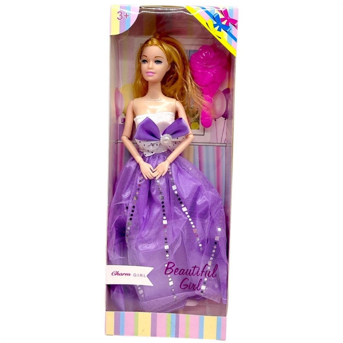 Лялька у святковій бузковій сукні з бантом — елегантна іграшка для сюжетних ігор. Модель має довге волосся, витончений образ та рухомі елементи, що дозволяють змінювати пози. Підходить для дітей від 3 років, сприяє розвитку уяви, емоційного сприйняття та інтересу до гри.