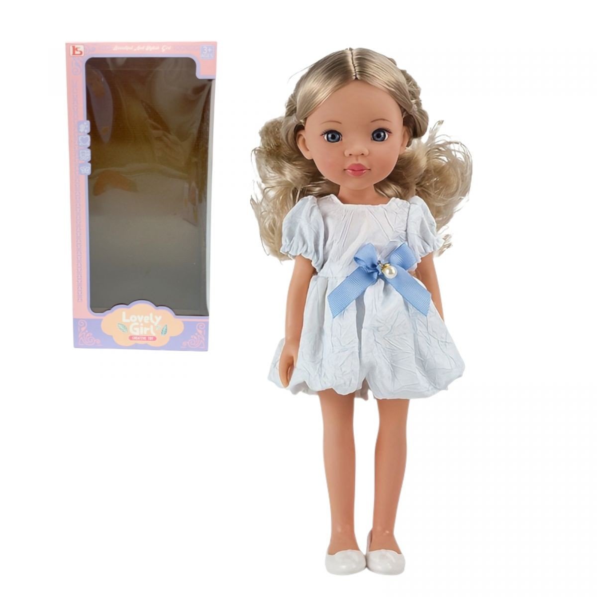 Опис Лялька в сукні з блакитним бантом, розмір 33см