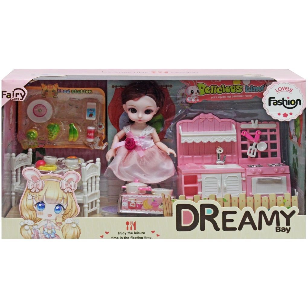 Чарівний набір з лялечкою та комплектом кухонних меблів та аксесуарів. Висота лялечки - 15 см, одягнена в гарне плаття і має рухливі суглоби. У наборі є кухонна шафка з мийкою, плита, обідній стіл та два стільці, набір кухонних приладів та продуктів харчування. Виконано із міцного пластику.