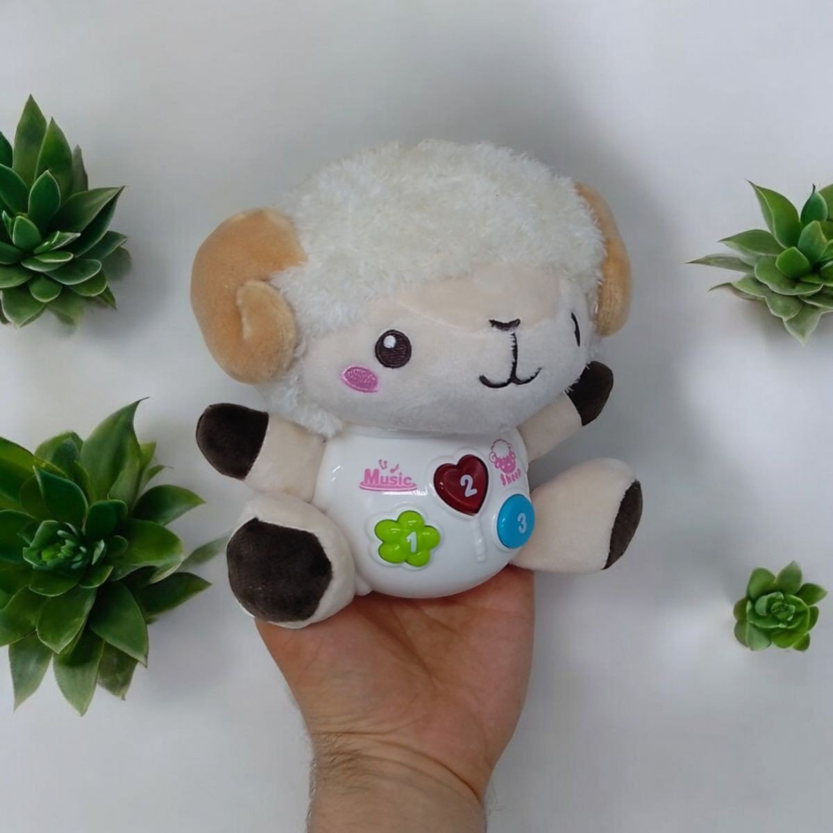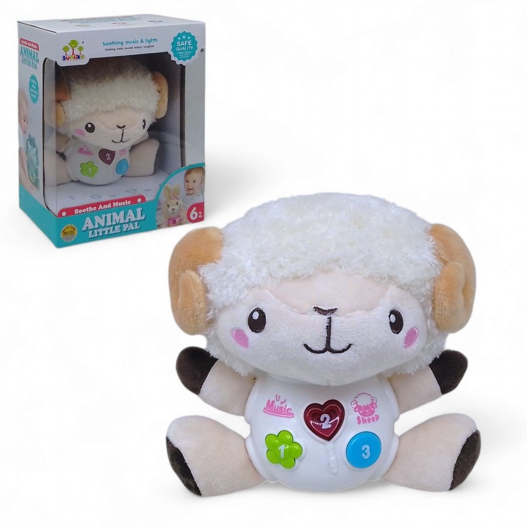 Мила іграшка у вигляді баранчика. Тіло пластикове, решта з мʼякого та приємного матеріалу. Оснащена трьома кнопками: звуки природи, кумедні звуки та колискові мелодії. Є мʼяке підсвічування для комфортного засинання. Працює від 2-х батарейок ААА (немає в комплекті).