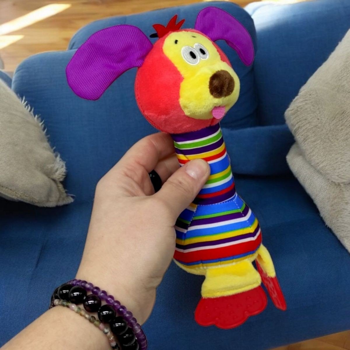 Опис Мʼяка іграшка-брязкальце з дзвіночком, собачка