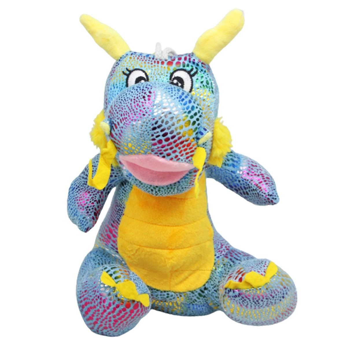 Мила мʼяка іграшка у вигляді кумедного дракончика з різнобарвною блискучою лускою. Іграшка мʼяка і приємна на дотик, виготовлена з якісних матеріалів. Очі вишиті на тканині. Іграшка щільно набита синтепоном та добре тримає форму. Розмір іграшки: 30 х 20 х 20 см. Іграшка буде чудовим подарунком дитині будь-якого віку.