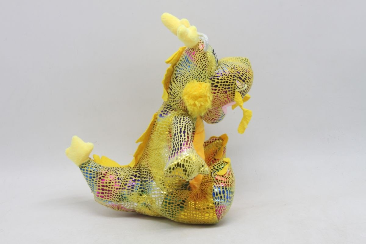 Мила мʼяка іграшка у вигляді кумедного дракончика з різнобарвною блискучою лускою. Іграшка мʼяка і приємна на дотик, виготовлена з якісних матеріалів. Очі вишиті на тканині. Іграшка щільно набита синтепоном та добре тримає форму. Розмір іграшки: 30 х 20 х 20 см. Іграшка буде чудовим подарунком дитині будь-якого віку.