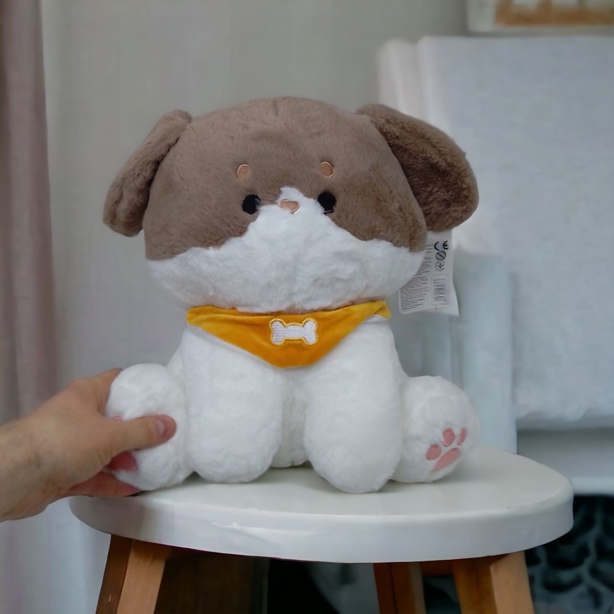 Чарівна дитяча іграшка у вигляді кумедного пухнастого цуценя. Іграшка виконана з якісних і дуже приємних на дотик тканин. Навколо шиї у цуценя повʼязана яскрава хустинка. Мордочка та лапки вишиті на тканині. Буде чудовим подарунком як дитині, так і дорослому. Розмір іграшки: 30х30х25 см.