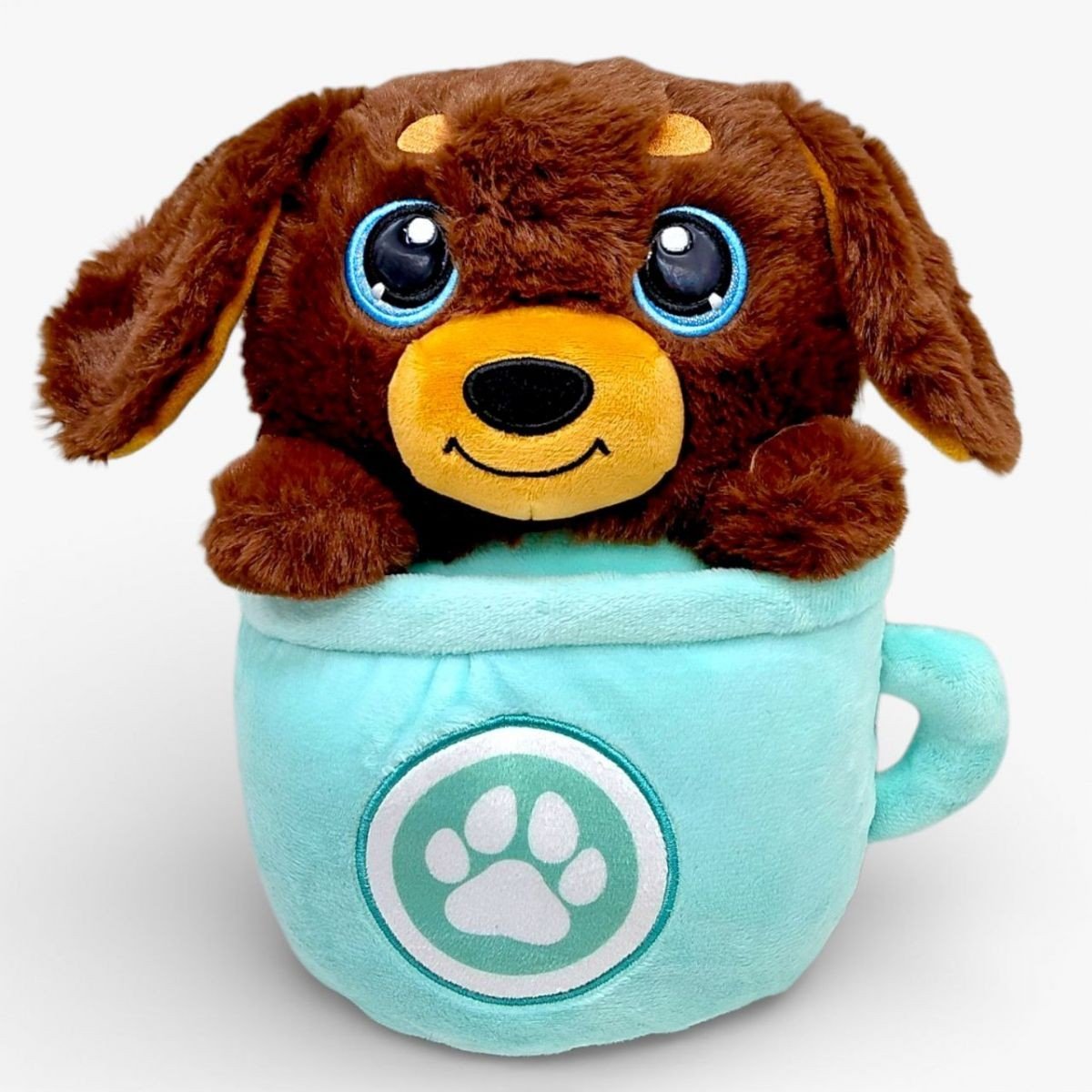 М’яка іграшка виконана у вигляді кумедної собачки, яка сидить у декоративній чашці з ручкою. Поєднання коричневого кольору песика та ніжного відтінку чашки створює привабливий вигляд.