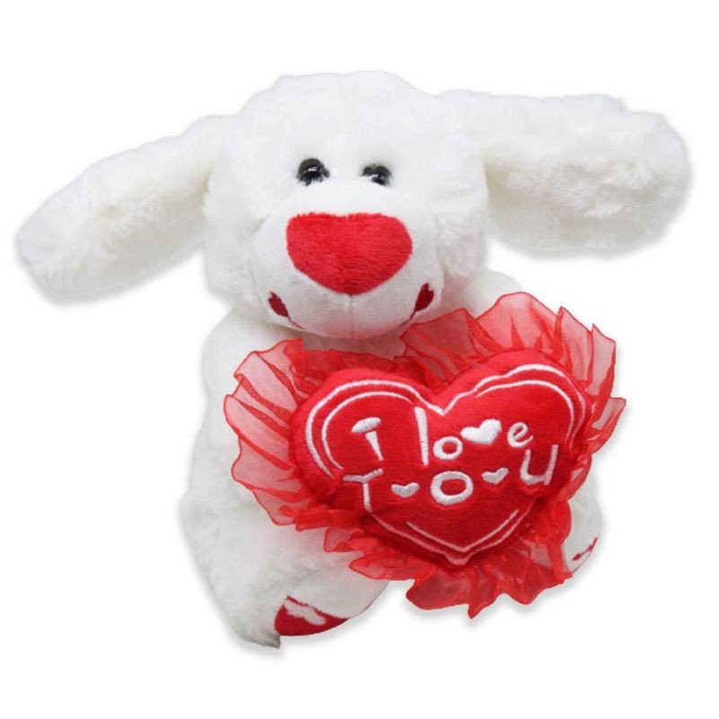 Мила плюшева іграшка у вигляді вухатого песика, який тримає в лапках серце з написом "I love you". Собачка м'яка, приємна на дотик. Виконана з якісних та безпечних матеріалів. Розмір іграшки: 17х17х21 см.