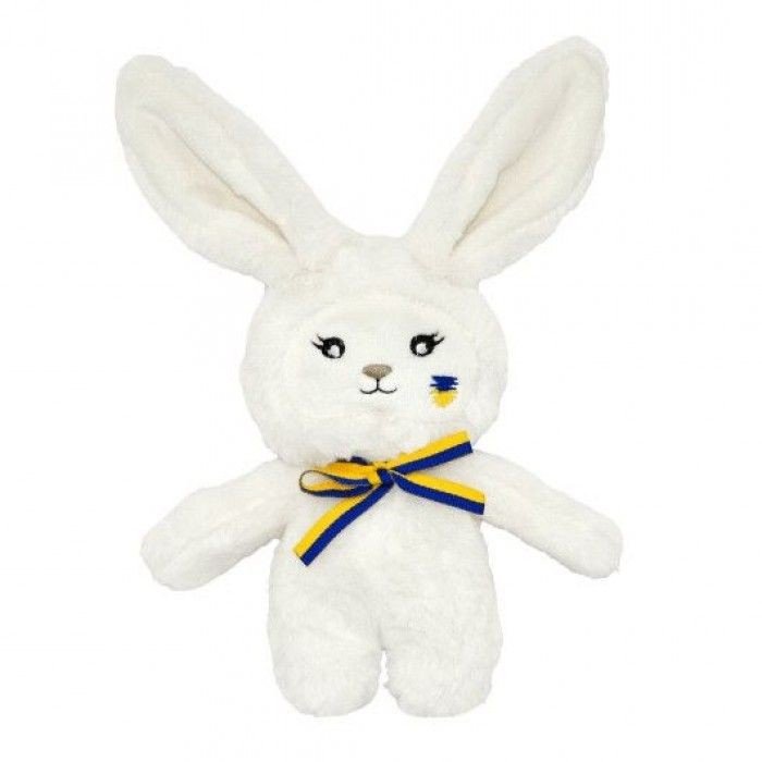 Чарівна мяка іграшка у вигляді зайчика з національною символікою. Навколо шиї у зайчика повязана синьо-жовта стрічка. Лапки шарудять, що обовязково сподобається малюкам. Іграшка виконана з дуже ніжної та приємної на дотик тканини. Розмір: 23х24х6 см.