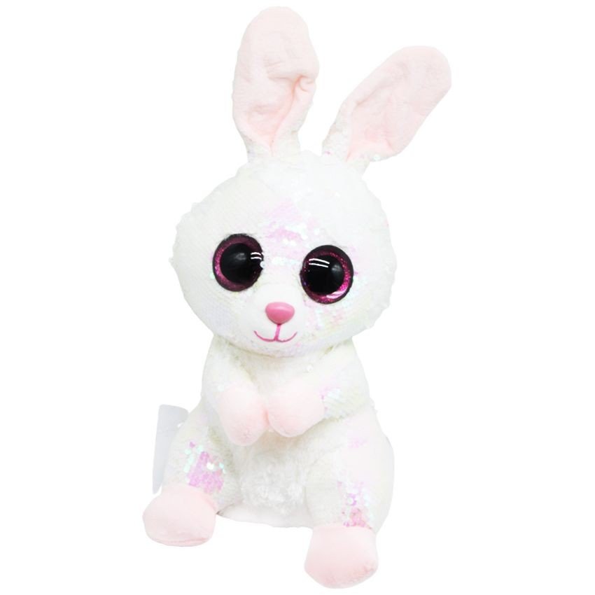 Дитяча мʼяка іграшка "Зайчик Глазастик", прикрашена двосторонніми паєтками, що переливаються. Дуже мʼяка, виготовлена з якісних матеріалів. Висота іграшки разом із вушками: 45 см.