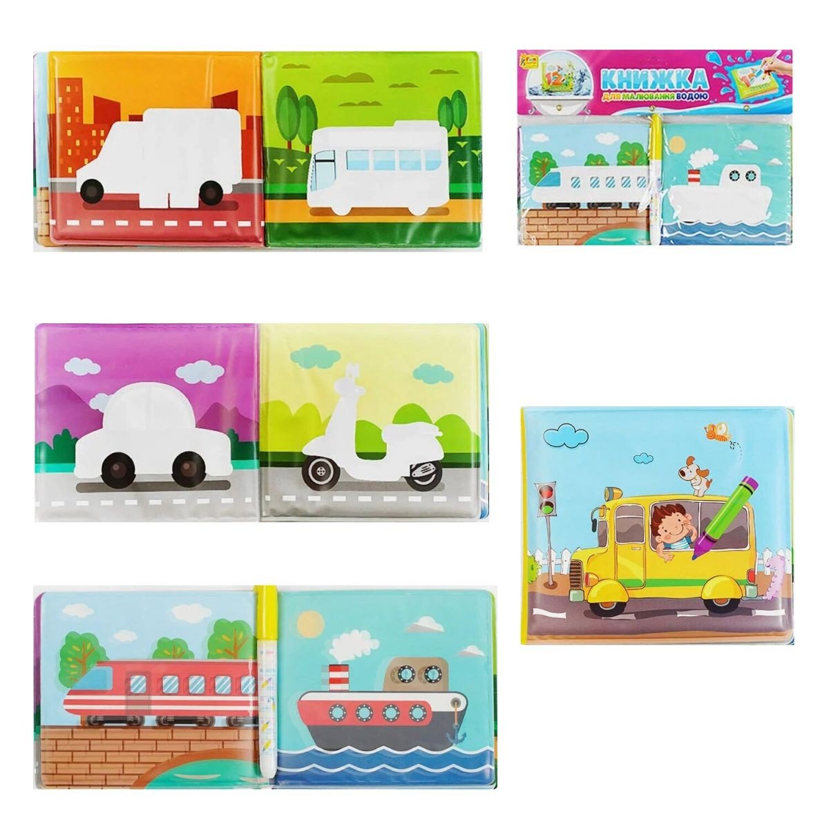 Оригінальна мʼяка книжка-розмальовка, де дитина зможе малювати водою. Мʼякі сторінки виконані із міцного водостійкого матеріалу. При контакті з водою, на малюнках проявляються кольори та контури. У наборі є маркер, який дитина може наповнити водою і використовувати як пензлик. У книзі 4 сторінки.