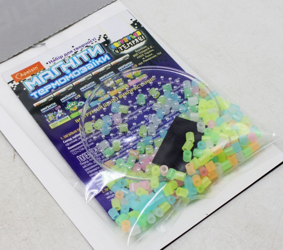 Набір для творчості "Термомозаїка" - це мозаїка із пластмасових різнокольорових намистин циліндричної форми. Ці намистини одягаються на основу – спеціальні планшети з короткими штирьками, а потім прогладжуються праскою через термопапір (кальку). При високій температурі верхній шар пластику плавиться, і намистини скріплюються між собою. Потім, готову фігурку можна приклеїти на магнітну основу та прикрасити нею холодильник чи магнітну дошку. Можна зібрати одну із двох запропонованих в інструкції картинок.
