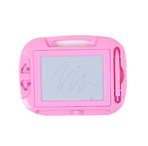 Яскрава пластикова дошка для малювання. Має магнітну основу. У наборі: магнітна ручка і 2 друку (у формі трикутника і сердечка). Готовий малюнок можна стерти, потягнувши за бігунок внизу дошки.